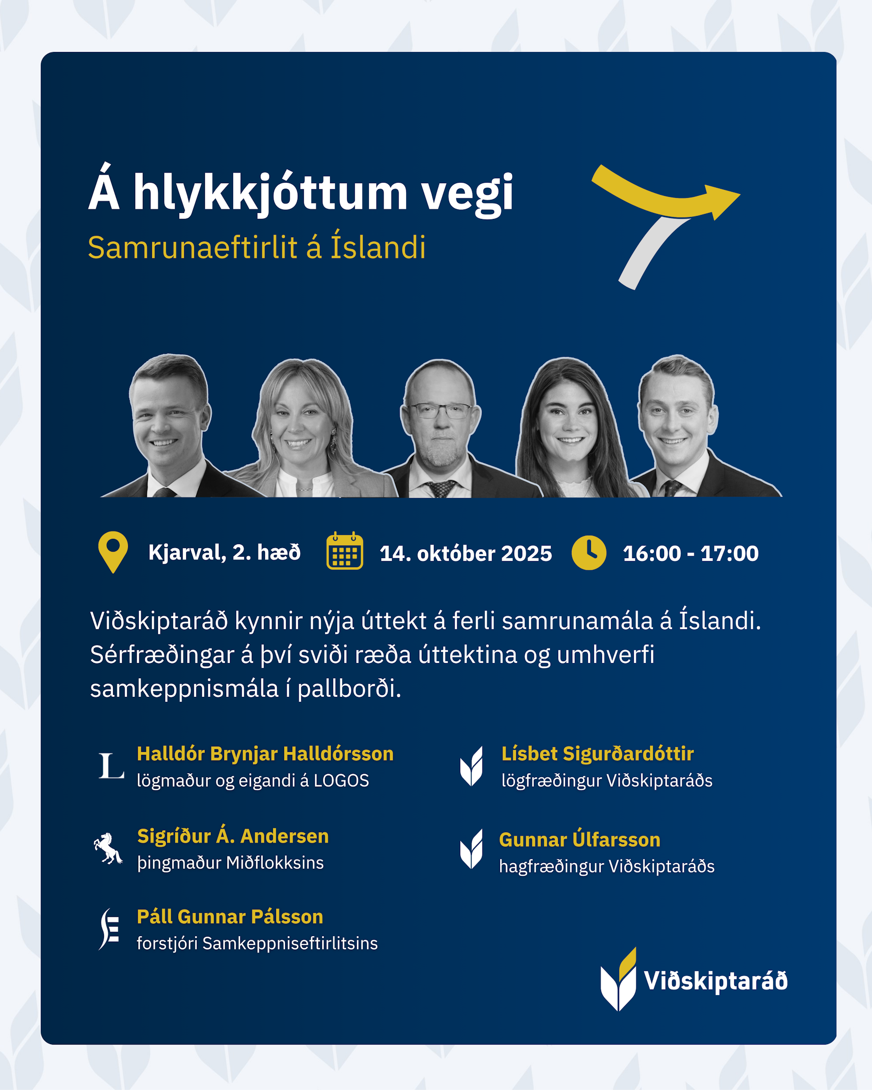 Viðskiptaráð kynnir nýja úttekt á samrunaeftirliti á Íslandi þriðjudaginn 14. október á Vinnustofu Kjarval, 2. hæð. Fundurinn hefst kl 16. Sérfræðingar á því sviði munu ræða úttektina og umhverfi samkeppnismála í pallborði.