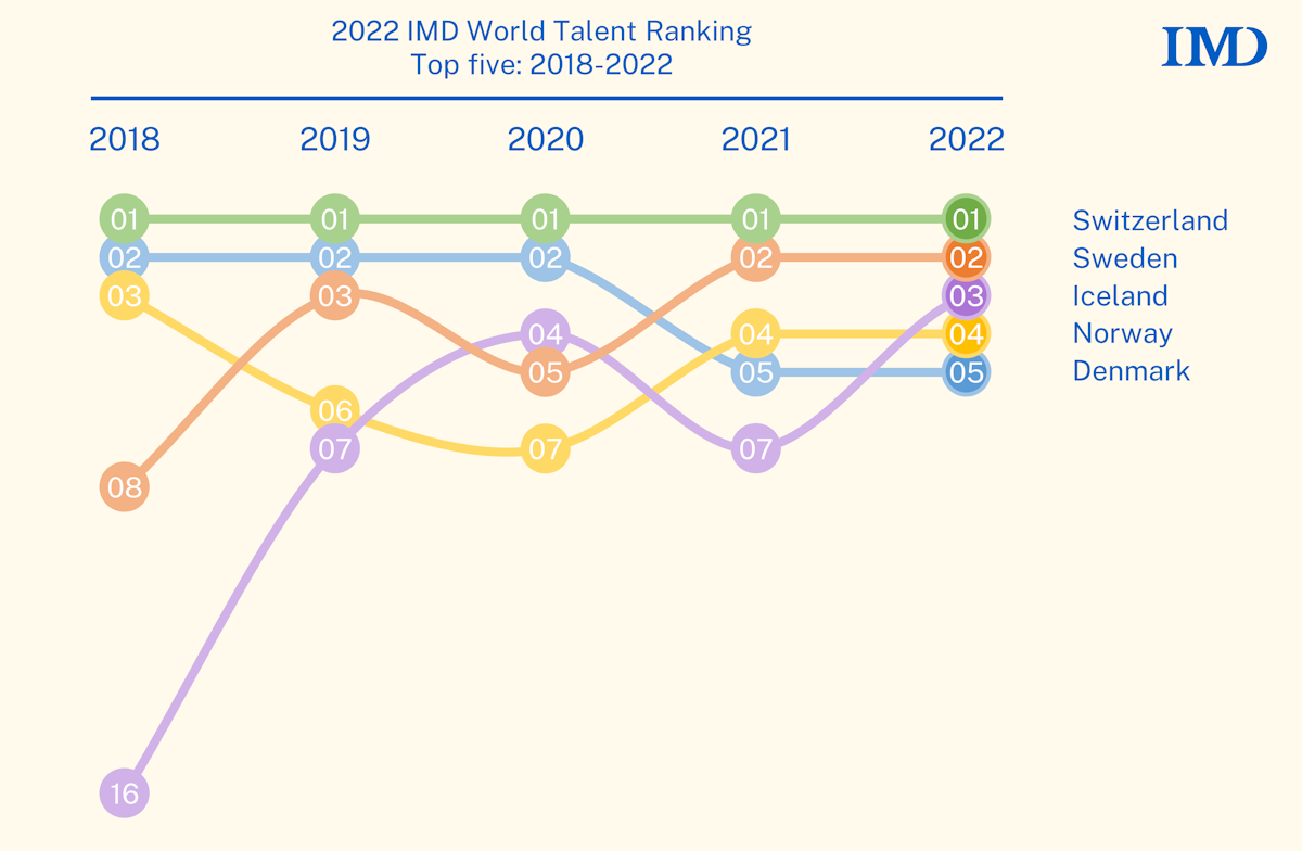 Ísland situr í þriðja sæti World Talent Ranking (WTR) 2022 úttektar IMD viðskiptaháskólans í Sviss og færist upp um fjögur sæti frá fyrra ári. Þar er Sviss í fyrsta sæti, sjötta árið í röð, og er fremst meðal 63 ríkja þegar kemur að því að laða að og halda í hæfileika. Svíþjóð, Noregur og Danmörk raða sér í 2., 4. og 5. sæti úttektarinnar.