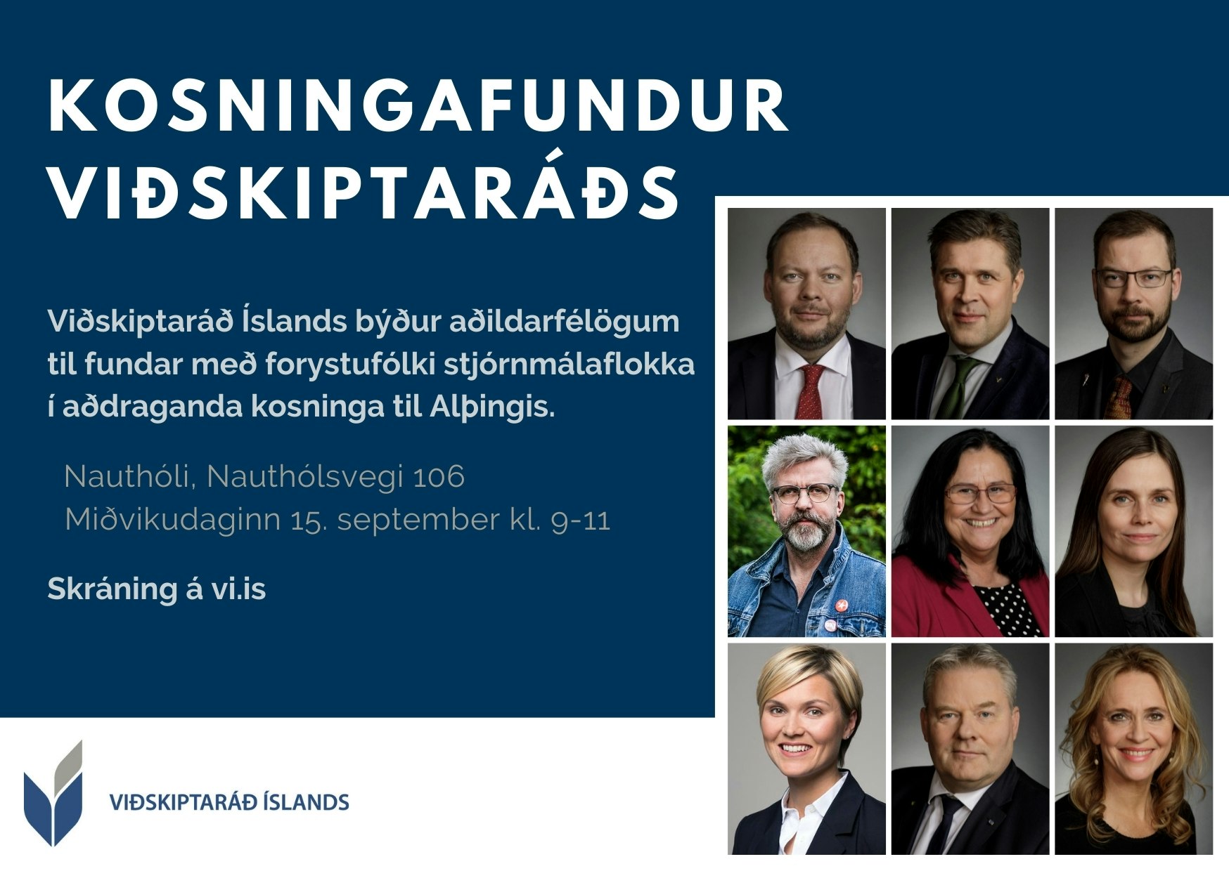 Viðskiptaráð Íslands býður aðildarfélögum sínum til morgunfundar með forystufólki stjórnmálaflokka á Nauthóli, miðvikudaginn 15. september kl. 9-11.
