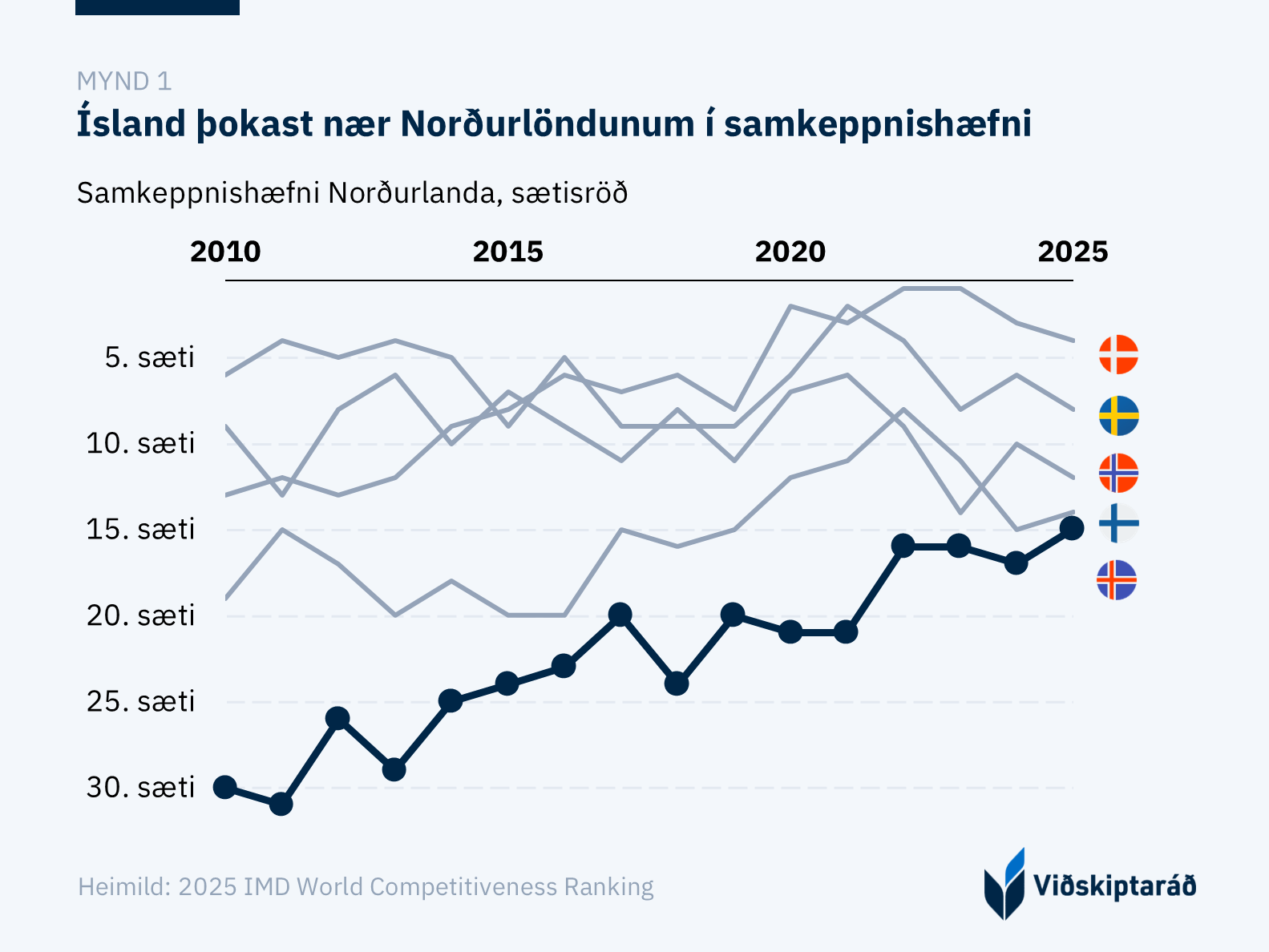 Samkeppnishæfni Íslands hefur aukist til muna undanfarin 15 ár en Ísland sat í 30. sæti árið 2010. Við höfum þannig sótt hratt á Norðurlöndin en þau hafa lengi vel skipað sér á meðal samkeppnishæfustu ríkja heims. Árið 2025 er Danmörk í 4. sæti, Svíþjóð í 8. sæti, Noregur er í 12. sæti og Finnland 14., aðeins einu sæti ofar en Ísland.