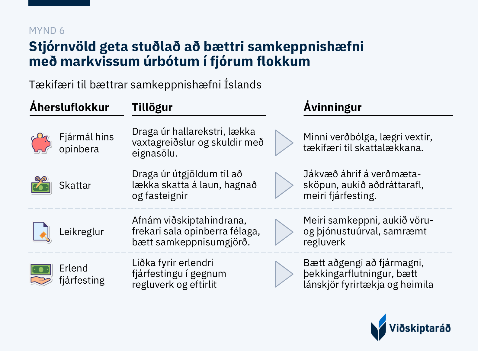 Viðskiptaráð hefur mótað tillögur í fjórum áhersluflokkum sem allar myndu bæta samkeppnishæfni Íslands og þannig auka hagsæld (mynd 6):