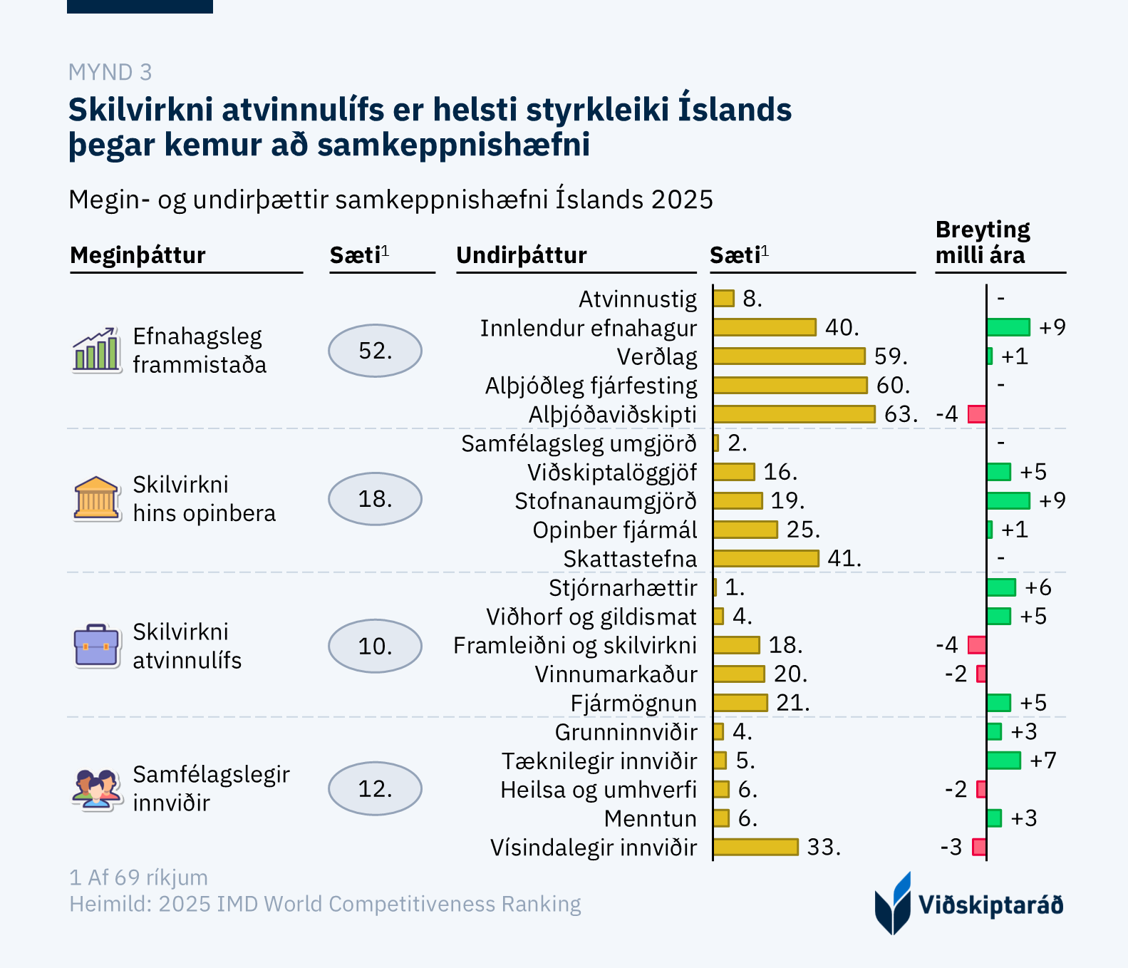 Ísland stendur framarlega í þremur af fjórum meginþáttum úttektarinnar. Það eru skilvirkni atvinnulífsins, samfélagslegum innviðum og skilvirkni hins opinbera. Á milli ára hækkar skilvirkni atvinnulífs mest, eða um þrjú sæti milli ár, en efnahagsleg frammistaða hækkar einnig um eitt sæti (mynd 2). Þá er staða samfélagslegra innviða óbreytt milli ára á meðan skilvirkni hins opinbera lækkar um eitt sæti.