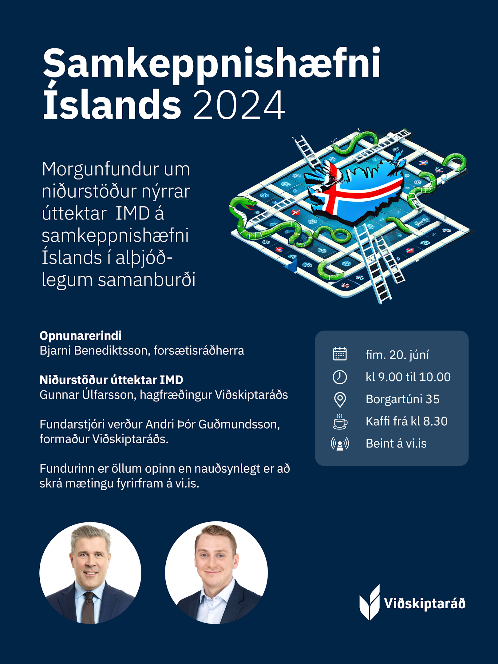 Morgunfundur um niðurstöður nýrrar úttektar IMD á samkeppnishæfni Íslands í alþjóðlegum samanburði. Fundurinn fer fram fimmtudaginn 20. júní 2024 í Borgartúni 35.