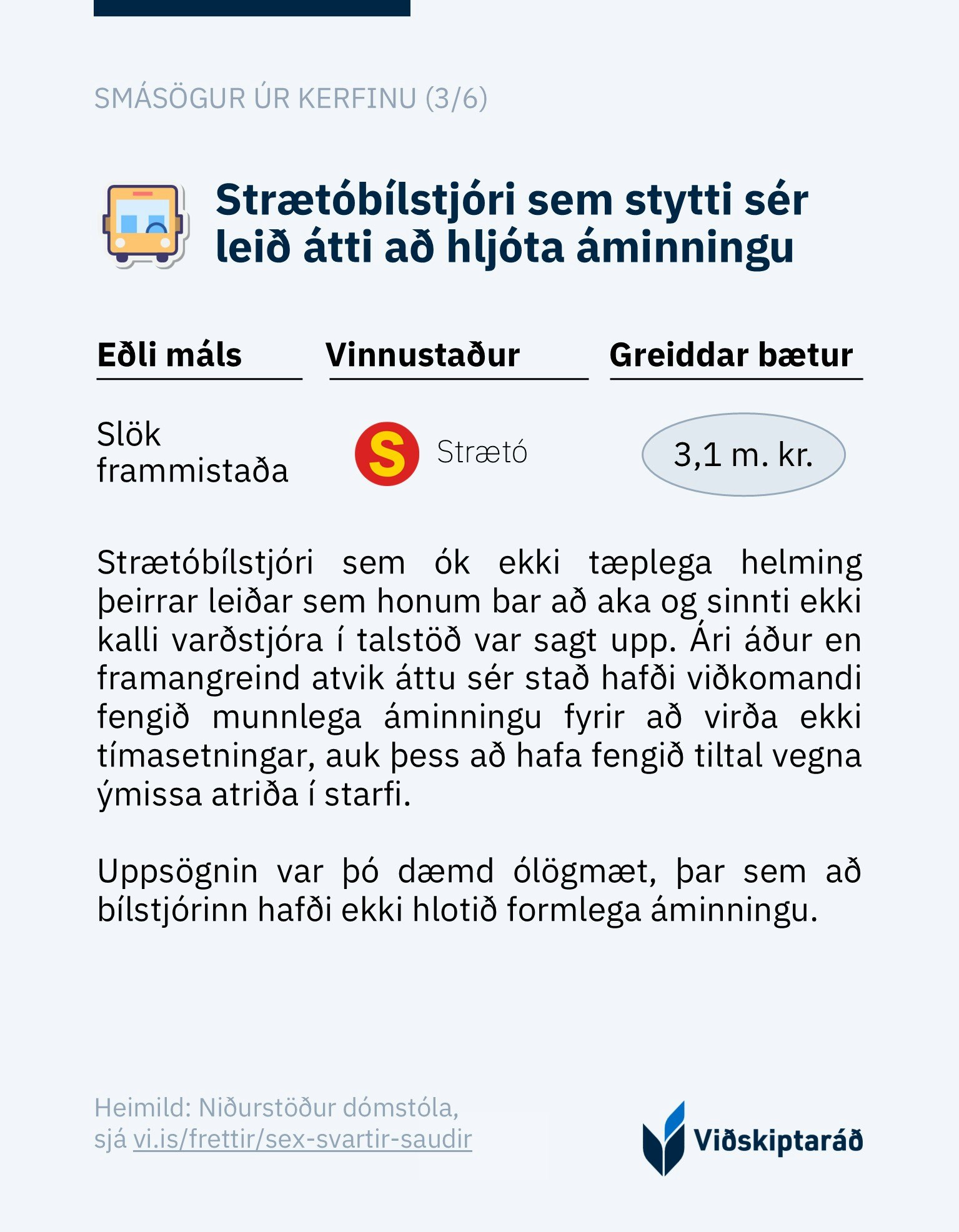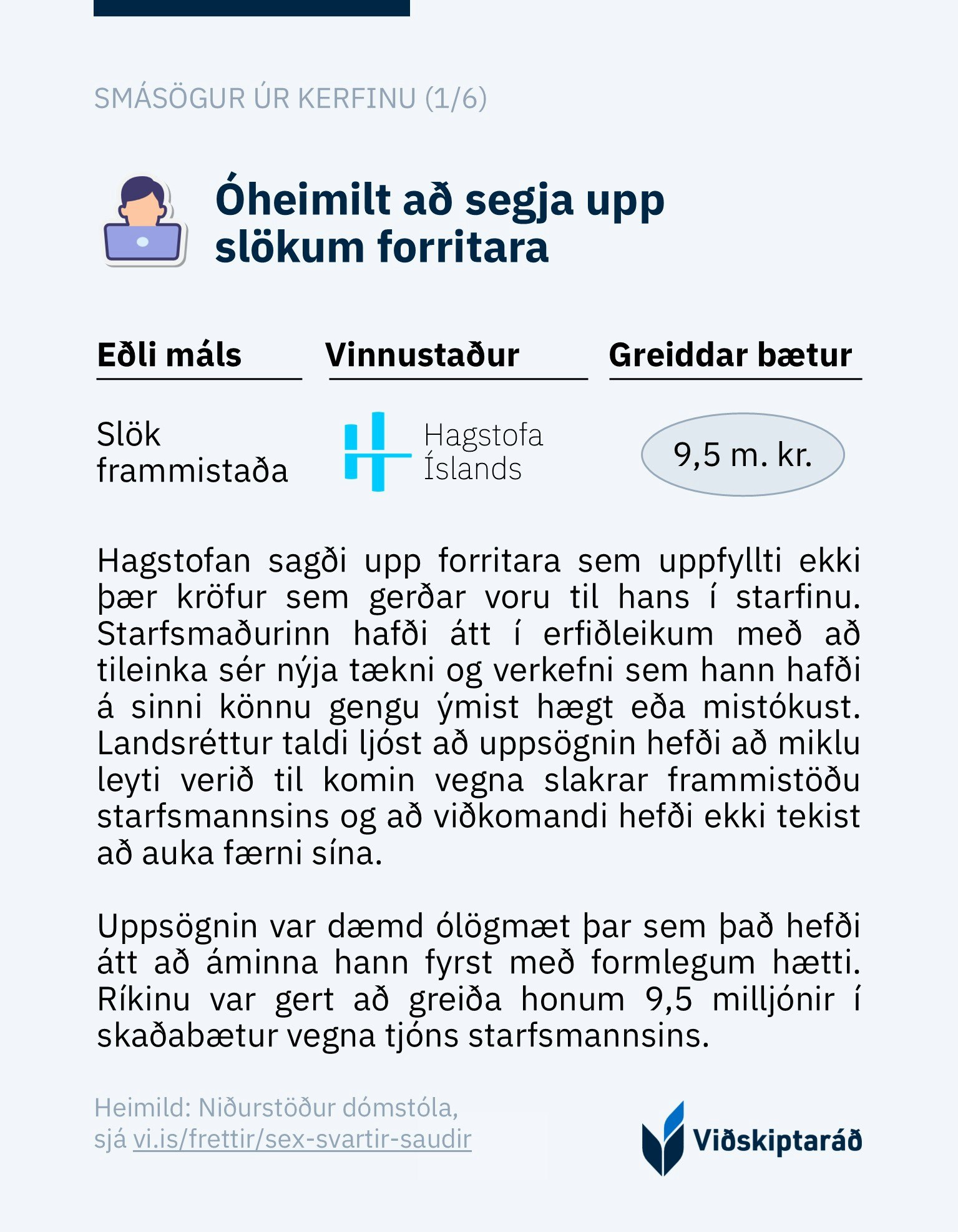 Viðskiptaráð hefur tekið saman sex smásögur sem varpa ljósi á hvernig rík uppsagnarvernd opinberra starfsmanna getur komið í veg fyrir uppsagnir „svartra sauða“ sem reynast óhæfir í starfi. Í frásögnunum eru misbrestir eða brot staðfest af dómstólum en reglur um starfslok koma engu að síður í veg fyrir lögmætar uppsagnir.