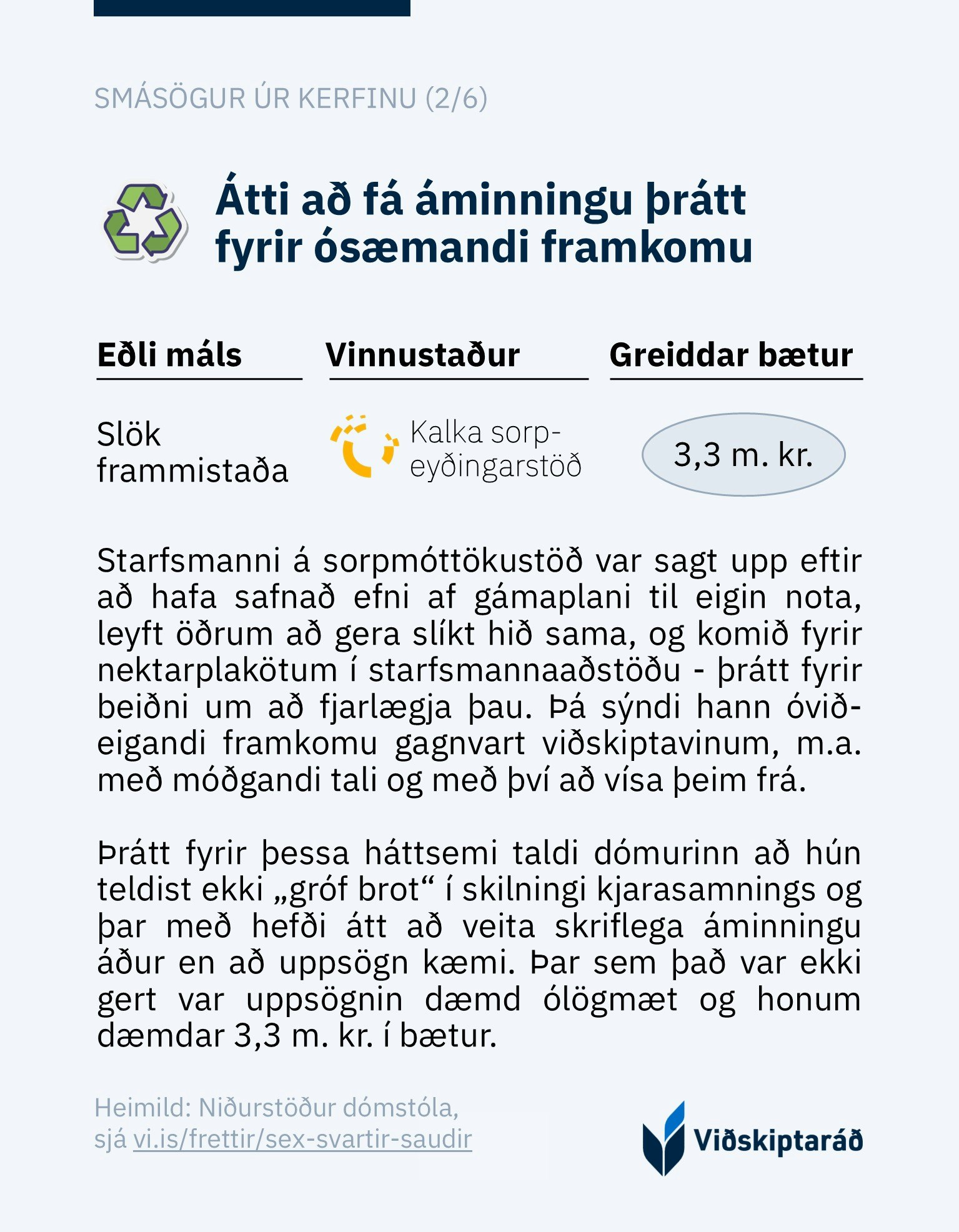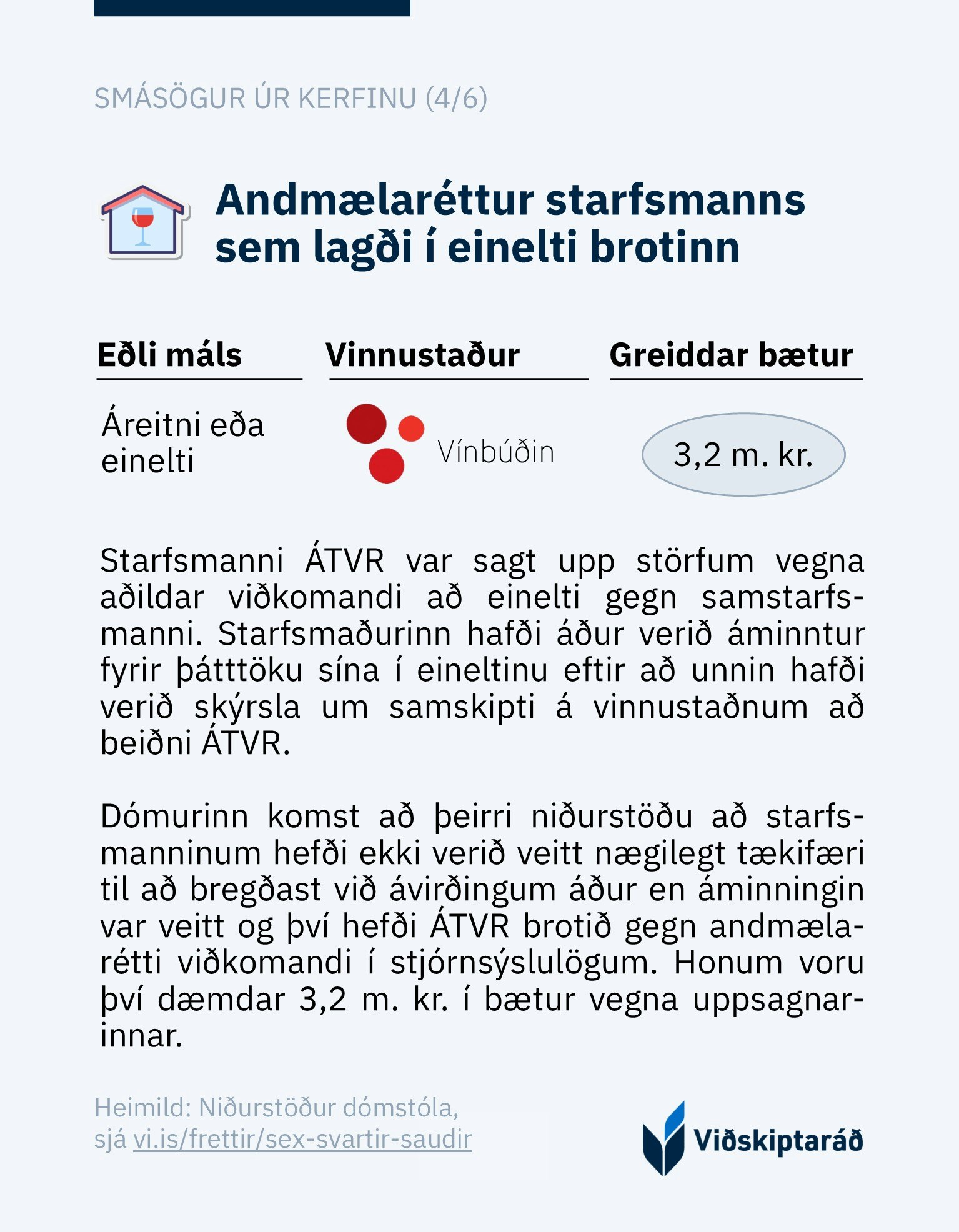 Í meðfylgjandi frásögnum voru uppsagnir dæmdar ólögmætar og hinu opinbera gert að greiða skaðabætur til starfsmanns sem sagt var upp. Sögurnar byggja á nýrri úttekt ráðsins sem ber heitið Svartir sauðir, glatað fé: uppsagnarvernd opinberra starfsmanna, þar sem fjallað er nánar um málið: