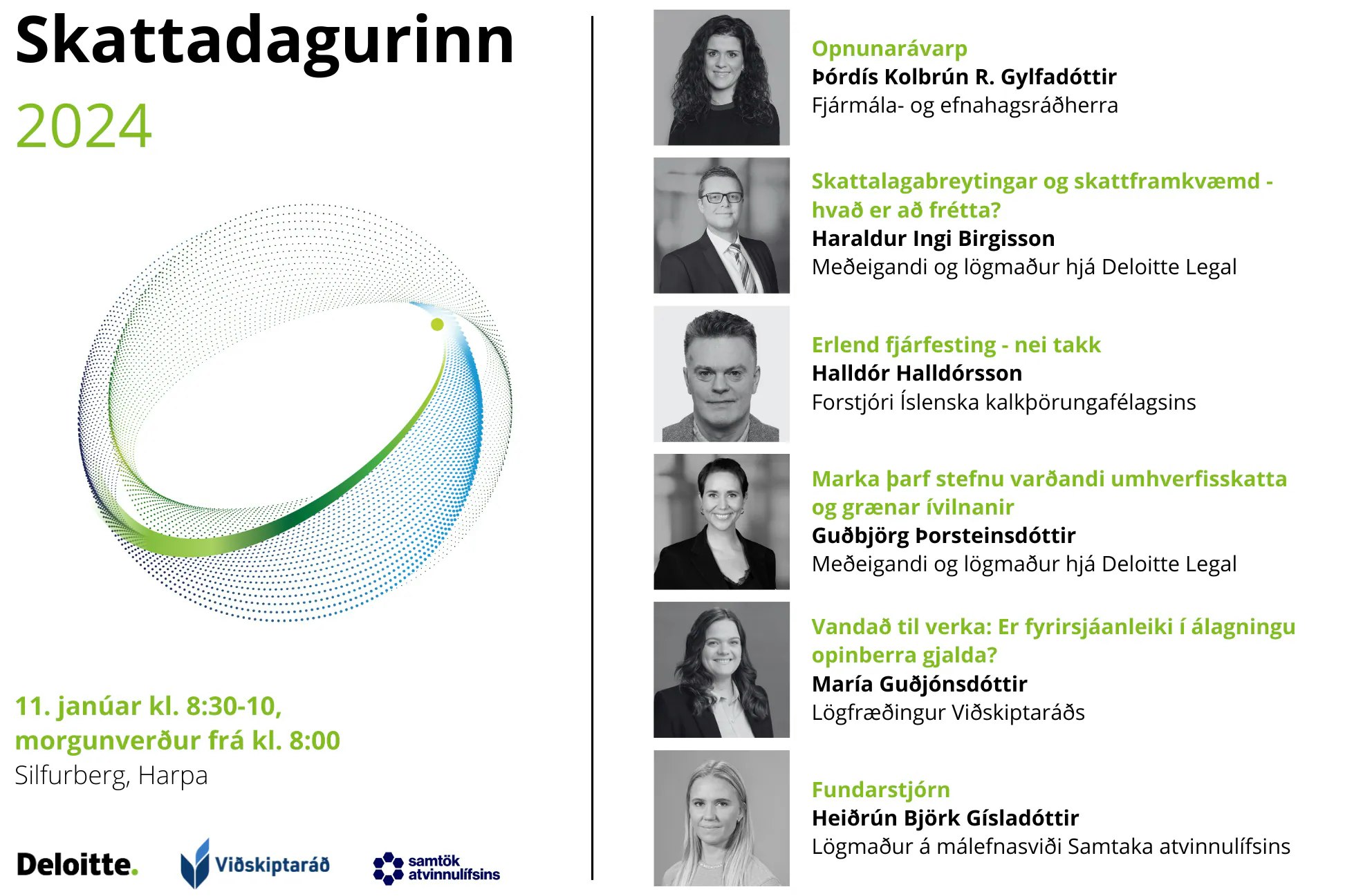 Skattadagur Deloitte, Viðskiptaráðs og Samtaka atvinnulífsins fer fram fimmtudaginn 11. janúar 2024 klukkan 8:30-10:00 í Silfurbergi, Hörpu. Léttur morgunverður er frá klukkan 8:00.