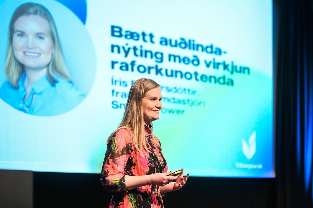 Íris Baldursdóttir, annar stofnandi og framkvæmdastjóri SnerpuPower, sagði frá lausnum í orkunýtingu.