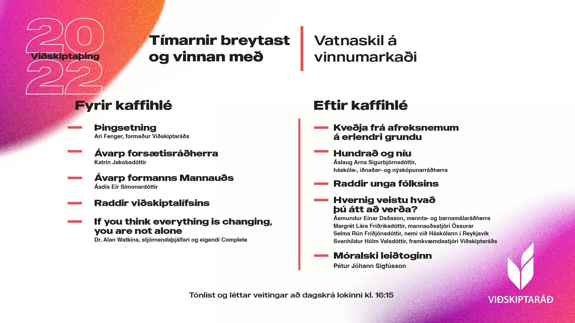 Viðskiptaþing 2022 mun fjalla um vinnumarkaðinn, vinnustaði og þær miklu breytingar sem virðast vera að eiga sér stað. Þurfum við að nálgast mannauðsmál á nýjan hátt? Hefur kannski aldrei verið mikilvægara að það sé gaman í vinnunni?