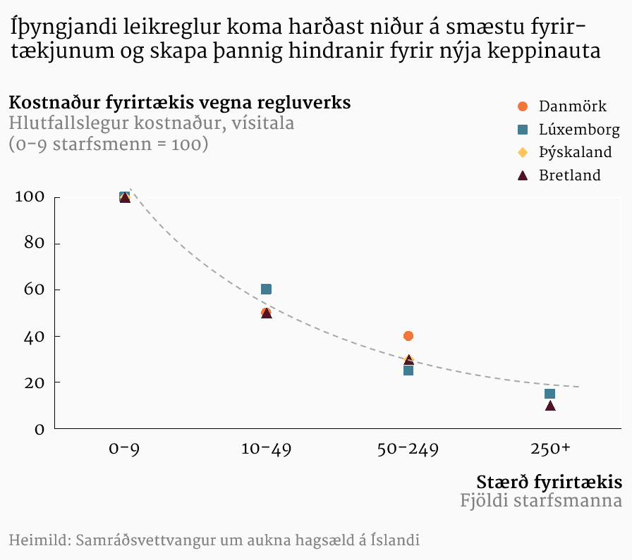 Leikreglum er ætlað að vernda heildarhagsmuni en kostnaður fyrirtækja vegna framfylgni þeirra deilist hins vegar ójafnt niður. Þannig bera smærri fyrirtæki mun þyngri byrðar vegna íþyngjandi leikeglna en þau sem stærri eru.