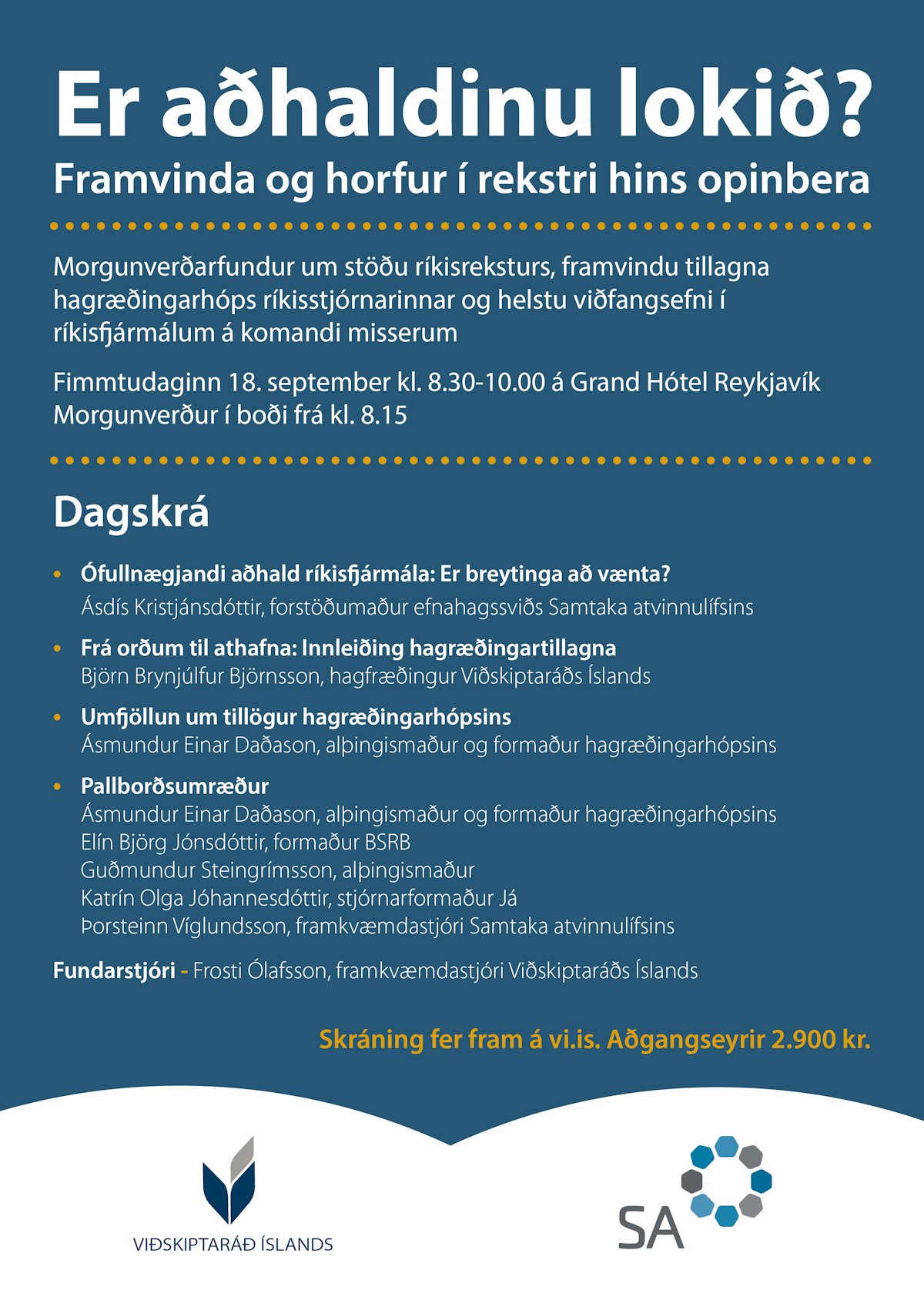 Viðskiptaráð Íslands og Samtök atvinnulífsins efndu til morgunverðarfundar um framvindu og horfur í rekstri hins opinbera. Sala ríkiseigna og framvinda tillagna hagræðingarhóps ríkisstjórnarinnar voru meðal umræðuefna.