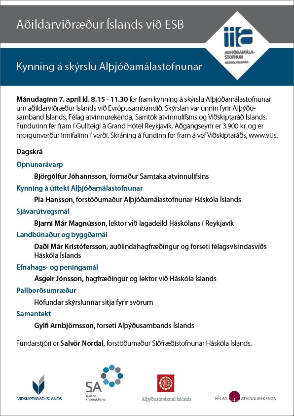 Mánudaginn 7. apríl kl. 8.15 - 11.30 fer fram kynning á skýrslu Alþjóðamálastofnunar um aðildarviðræður Íslands við Evrópusambandið. Skýrslan var unnin fyrir Alþýðusamband Íslands, Félag atvinnurekenda, Samtök atvinnulífsins og Viðskiptaráð Íslands.