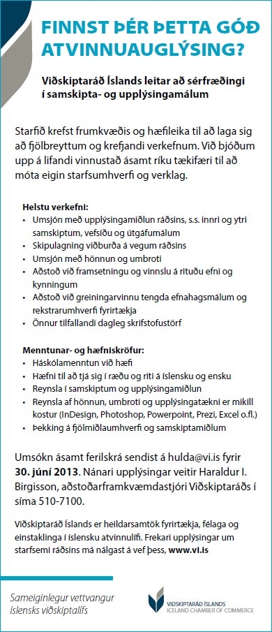 Viðskiptaráð Íslands leitar að sérfræðingi í samskipta- og upplýsingamálum. Starfið krefst frumkvæðis og hæfileika til að laga sig að fjölbreyttum og krefjandi verkefnum. Við bjóðum upp á lifandi vinnustað ásamt ríku tækifæri til að móta eigin starfsumhverfi og verklag.
