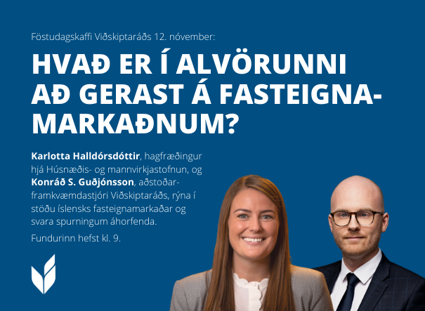 Næsta Föstudagskaffi Viðskiptaráðs verður föstudaginn 12. nóvember klukkan 9. Þar munu Karlotta Halldórsdóttir, hagfræðingur hjá HMS, og Konráð S. Guðjónsson, aðstoðarframkvæmdastjóri VÍ, rýna í stöðuna á fasteignamarkaðnum.