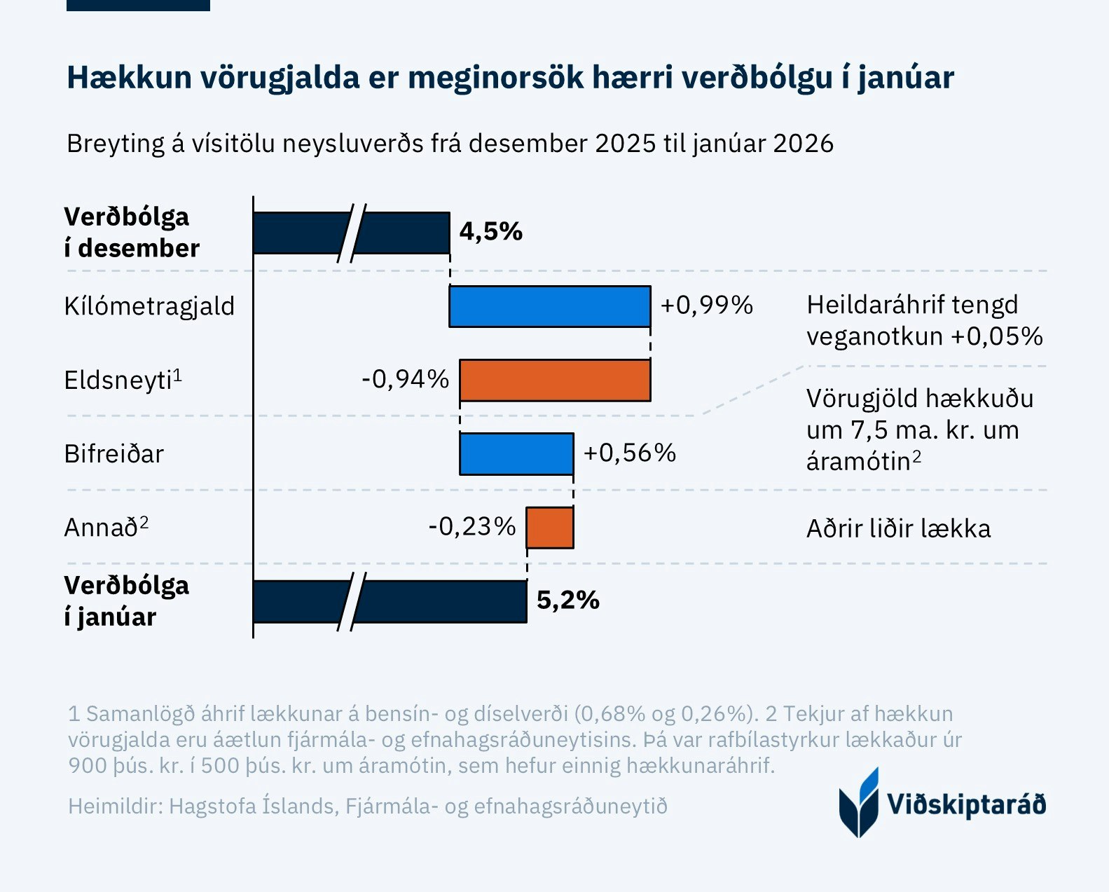 Stjórnvöld virðast hins vegar hafa misreiknað áhrif hærri vörugjalda á ökutæki og skertra rafbílastyrkja hrapallega. Í minnisblaði frá fjármálaráðuneytinu kom fram að áætluð áhrif hærri vörugjalda yrðu um 0,10% til hækkunar á vísitölu. Raunin varð 0,56% hækkun. Sú hækkun er stærsti orsakaþáttur hærri verðbólgumælingar núna í janúar.