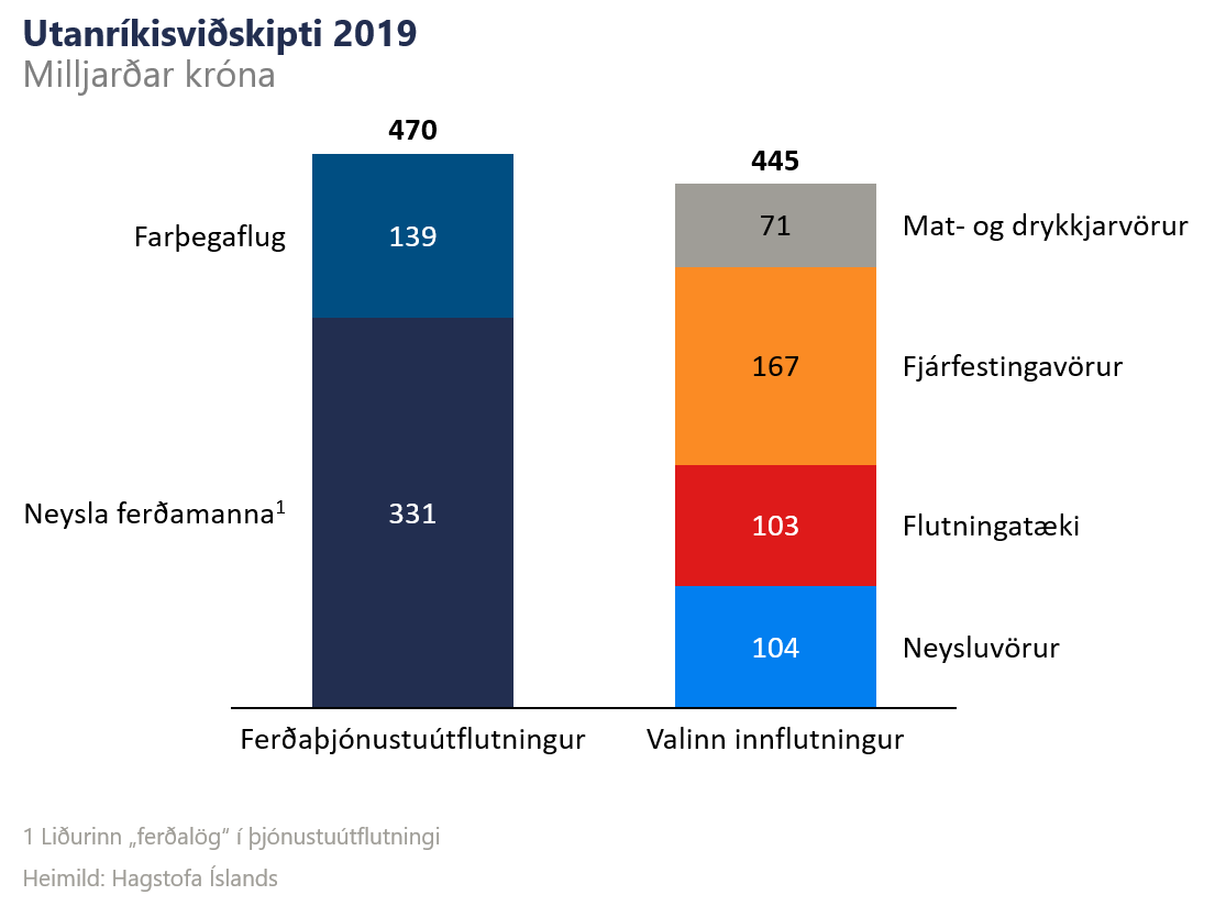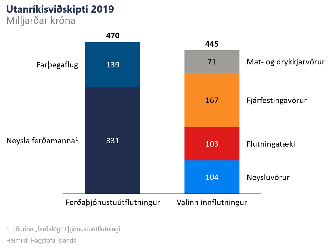 Fyrir lítið land með einhæfa framleiðslu er útflutningur grundvallarforsenda innflutnings sem er svo aftur mikilvægur þáttur í okkar neyslu, fjárfestingum og daglegu lífi. Því er ekki hægt að bera saman framlag innlendrar neyslu og útflutningstekna til landsframleiðslu eins og það kemur af skepnunni þar sem annað (neysla) er að talsverðu leyti háð hinu (útflutningstekjum). Með einföldun má segja að ferðaþjónusta hafi séð fyrir þeim gjaldeyri sem þurfti til að flytja inn allar mat-, fjárfestingar- og neysluvörur auk flutningatækja árið 2019. Og gott betur (sjá mynd).