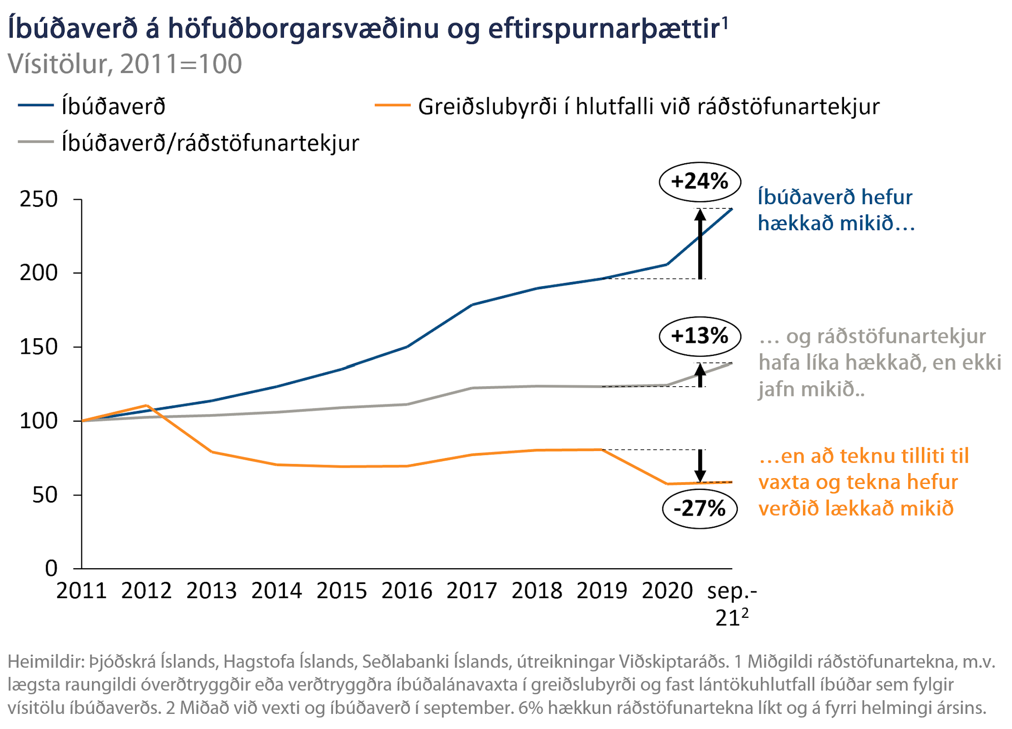 Íbúðaverð ræðst yfirleitt af eftirspurnarþáttum til skamms tíma, einkum tekjum landsmanna og fjármagnskostnaði – vöxtum, eins og sjá má á myndinni hér að neðan. Íbúðaverð hefur meira en tvöfaldast sl. áratug og þar af hækkað um 24% á höfuðborgarsvæðinu frá árinu 2019. Tekjur landsmanna hafa á sama tíma hækkað mikið en þó mun minna og hefur íbúðaverð líklega hækkað 13% meira en miðgildi ráðstöfunartekna frá 2019. Það er þó bara hálf sagan því lækkun vaxta hefur gert það að verkum að greiðslubyrði fyrir sömu íbúð og sama lánshlutfall hefur lækkað á sama tíma um 27%, þrátt fyrir þessar miklu íbúðaverðshækkanir. Greiðslubyrðin virðist raunar aldrei hafa verið lægri í Íslandssögunni og því ættu miklar íbúðaverðshækkanir ekki að koma mikið á óvart.