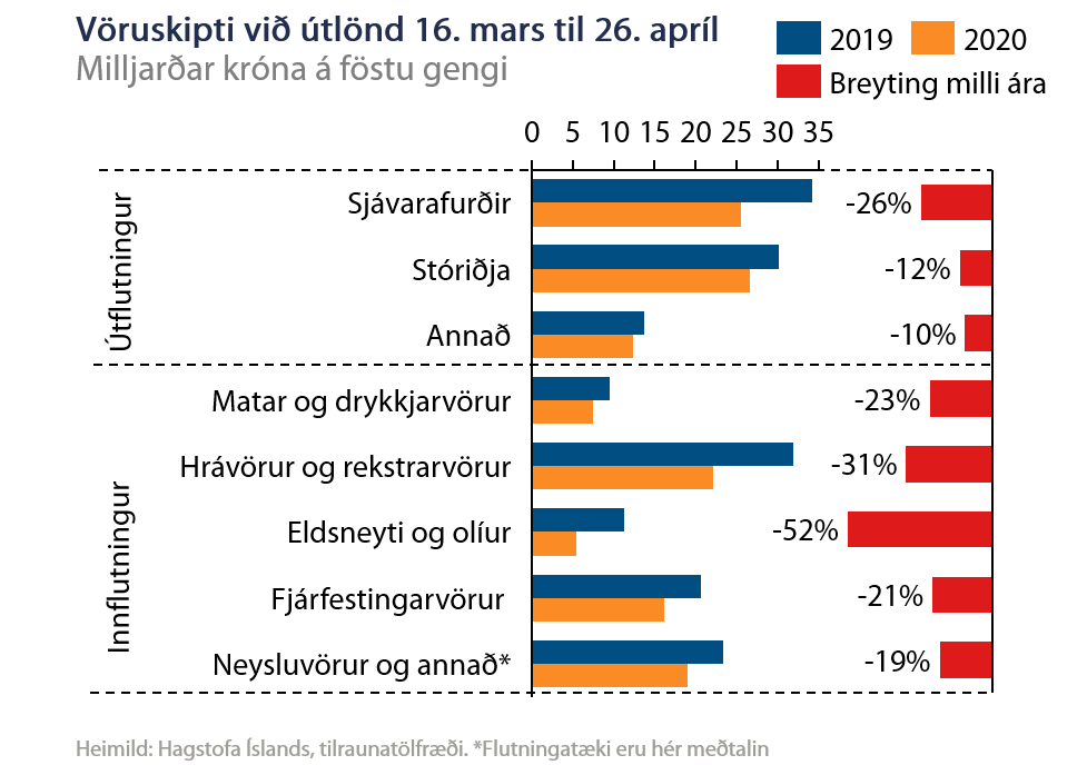Rétt er að nefna að bæði inn- og útflutningur tóku við sér þegar leið á apríl. Vikuna 19.-26. apríl var innflutningur t.a.m. einungis 3% minni en sömu viku 2019. Raunverulegur viðsnúningur eða svikalogn? Tíminn mun leiða svarið í ljós.