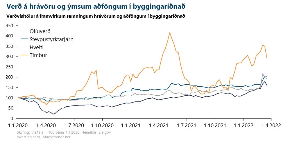 Innfluttar vörur skýra nú tæplega þriðjung af verðbólgu en verðbólga er komin á skrið víðsvegar um heiminn. Þar að auki setur hækkandi verð á innfluttum aðföngum í byggingariðnaði aukinn þrýsting á húsnæðismarkaðinn til lengri tíma. Vísbendingar eru um að nú sé erfiðara að sniðganga alþjóðlegar verðhækkanir með því að leita til annarra eða nýrra markaða. Það er m.a. vegna þess að markaðurinn í Úkraínu hefur þurrkast út og Rússar og Hvítrússar hafa verið teknir út af heimsmarkaði með viðskiptaþvingunum. Þó svo að hagtölur gefi til kynna að viðskipti við Rússland, Úkraínu og Hvíta-Rússland með aðföng í byggingariðnað séu ekki mikil er þó rangt að álykta að áhrif stríðsins séu óveruleg og má þar til dæmis nefna tvennt. Annars vegar er um 10% af steypustyrktarjárni í heiminum framleitt í Úkraínu og Rússlandi og hið síðarnefnda er stærsti útflytjandi timburs. Þar að auki er innflutningur til Íslands frá þessum löndum að vissu leyti rangt skráður í hagtölum. Meirihluti innflutts steypustyrktarjárns er frá Hvíta-Rússlandi og stór hluti innflutts timburs frá Rússlandi en flutt til landsins eftir vinnslu í Eystrasaltsríkjunum.[3] Viðvarandi áhrif heimsfaraldurs í Kína eru einnig til þess fallin að draga úr framleiðslu á stáli og ýta þannig undir verðhækkanir á heimsmörkuðum. Þessar verðhækkanir hafa kannski ekki komið fram í innlendu verðlagi en erlendir birgjar hafa þó boðað hækkanir á stálvirki. Öllum ætti að vera ljóst að ekki er hægt að byggja steypt hús án styrktarjárnsins og því óljóst hvort markaðurinn ná jafnvægi á næstu misserum.[4]