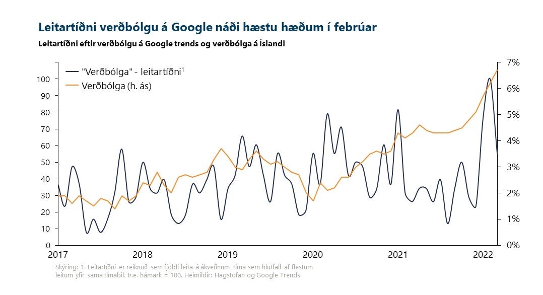 Í ljósi hækkana á bensínverði, húsnæðismarkaði og ýmsum öðrum vörum og þjónustu hafa landsmenn væntanlega orðið varir við aukna umræðu um verðbólgu í daglegu lífi og fréttamiðlum. Áhugi Íslendinga á verðbólgu virðist hafa náð hæstu hæðum í febrúar ef marka má leitartíðni á Google. Hugtakinu „verðbólga“ var flett upp oftast í febrúarmánuði samanborið við leitartíðni síðustu fimm ára en verðbólgutölur marsmánaðar gætu aukið „vinsældir“ hugtaksins enn frekar. Að sama skapi hafa verðbólguvæntingar markaðsaðila til fimm ára ekki verið svo háar síðan í lok árs 2018.[1]
