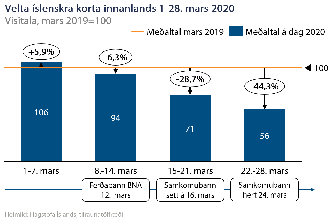 „Fabúleringar“ er orð sem lýsir vel vangaveltum um áhrif COVID-19 á hagkerfið. Sem betur fer er smám saman hægt að draga úr fabúleringum og styðjast í auknum mæli við gögn. Í síðustu viku fengum við t.a.m. nýja tilraunatölfræði frá Hagstofunni sem sýnir að kortavelta Íslendinga innanlands minnkaði um ca. 18% milli ára í mars og vikuna 22.-28. mars var veltan 44% minni en að meðaltali í mars 2019*.