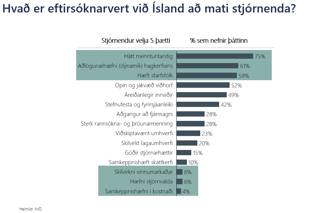 Samkeppnishæfni ríkja er að hluta leiðarvísir fyrirtækja um hvar sé vænt rekstrarumhverfi og hvernig ríki stuðli að sjálfbærri verðmætasköpun. Vert er þó að taka fram að mælikvarðinn segir ekki alla söguna. Niðurstöður stjórnendakönnunar IMD, sem er framkvæmd samhliða könnun IMD á samkeppnishæfni, gefa þá auk þess til kynna hvað sé eftirsóknarvert við Ísland að mati stjórnenda. Niðurstöðurnar leiða í ljós að hátt menntunarstig er sá þáttur sem er hvað eftirsóknarverðastur við Ísland en aðlögunarhæfni hagkerfisins batnar jafnframt mikið á milli ára.