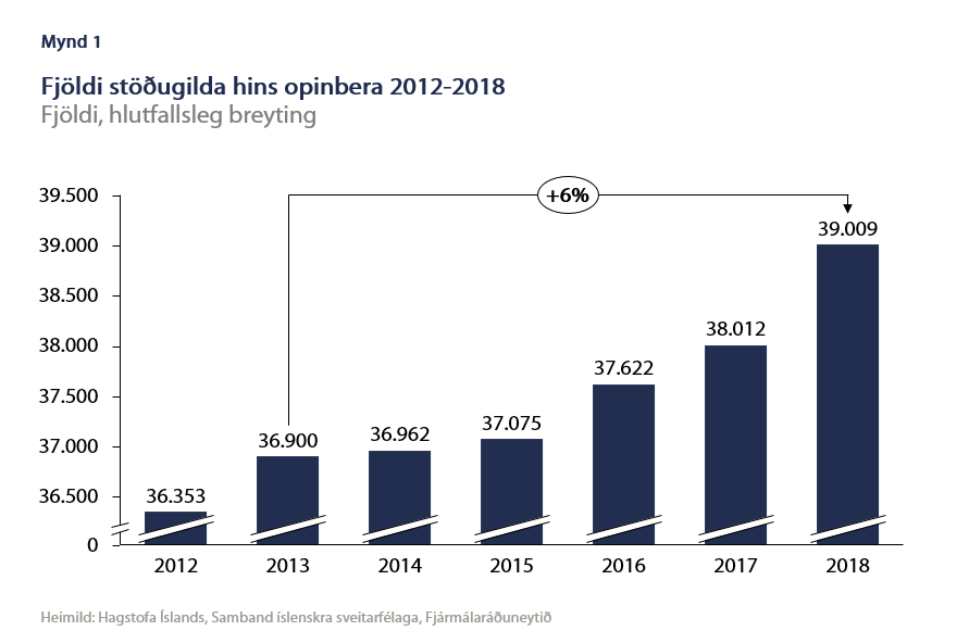 Frá því hagræðingartillögurnar 111 voru kynntar árið 2013 til og með 2018 hefur fjöldi stöðugilda hjá hinu opinbera aukist um 6% eða rúmlega 2.100 störf (sjá mynd 1). Hafa þau ekki verið fleiri frá því Viðskiptaráð hóf samantekt á tölum um opinbera starfsmenn sem byggir á upplýsingum frá Fjármálaráðuneyti og Sambandi íslenskra sveitarfélaga. Tölur þessara aðila fyrir árið 2019 liggja ekki fyrir. Hins vegar liggja fyrir tölur Hagstofunnar um fjölda starfandi árið 2019 sem sýna, að opinberum starfsmönnum fjölgaði um liðlega 4,2% á því eina ári 2019 eða um tæplega 2.300 manns á sama tíma og fjöldi starfa á einkamarkaði dróst saman um 2,6% eða tæplega 3.900 manns.
