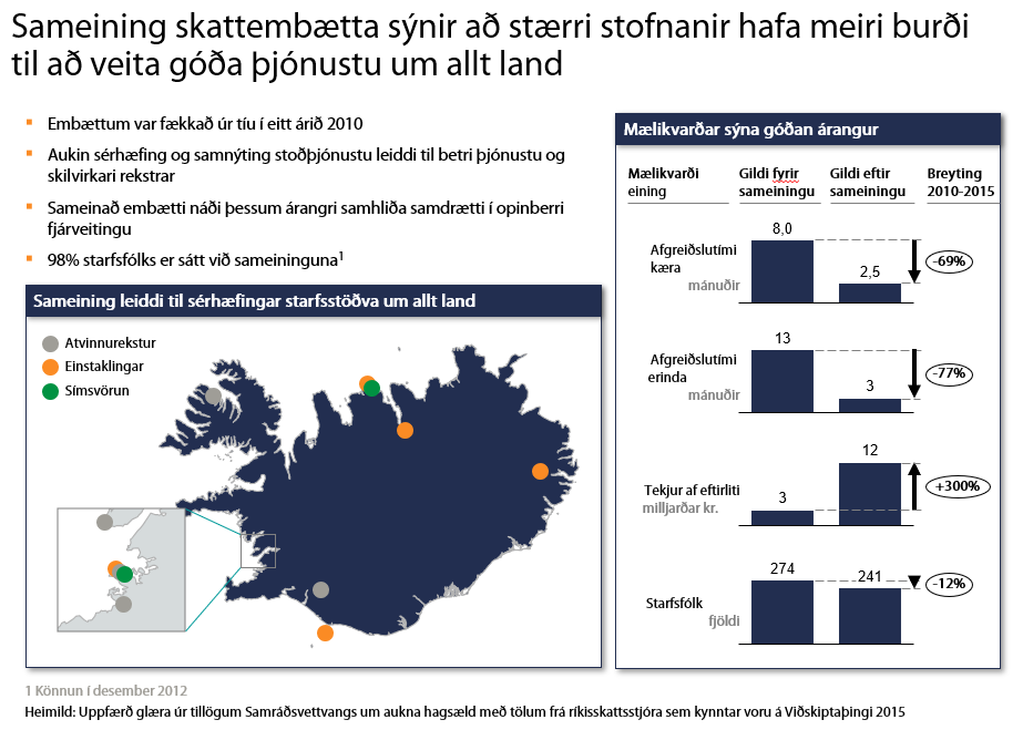 Reynslan sýnir að vel útfærðar sameiningar skila margvíslegum ávinningi, ekki síður faglegum en fjárhagslegum. Fækkun skattstjóraembætta úr tíu í eitt árið 2010 skilaði faglegum ávinningi: afgreiðslutími kæra styttist um 69% á fyrstu fimm árunum, afgreiðslutími erinda styttist um 77% og 98% starfsfólks voru ánægð með sameininguna. Sömu sögu má segja þegar lögregluembætti höfuðborgarsvæðisins voru sameinuð í eitt árið 2006, en þá jókst hlutfall upplýstra mála um 29% á fyrstu sex árunum, eignaspjöllum fækkaði um 40% og ánægja með störf lögreglunnar jókst um 5% á sama tímabili. Bættur árangur þessara embætta náðist á sama tíma og opinber fjárframlög til beggja stofnana drógust saman. Sameiningar snúast því ekki síður um að bæta þjónustu en að auka hagkvæmni.