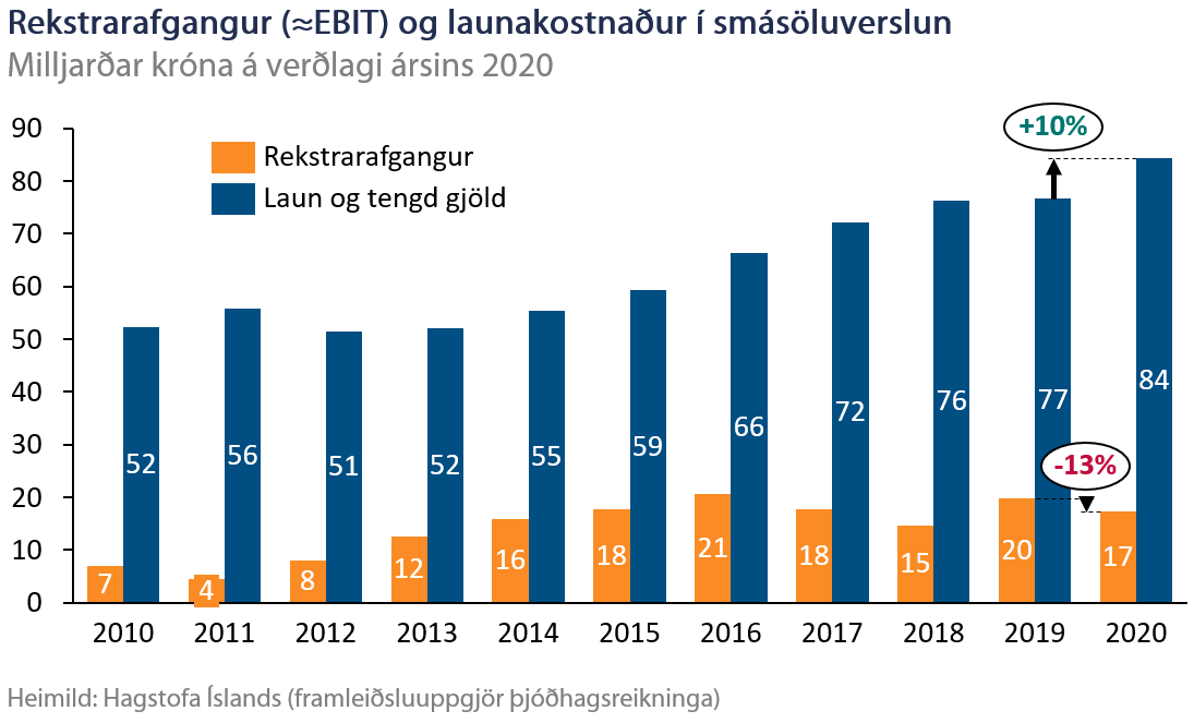 Svigrúm verslunarinnar til að halda aftur af verðhækkunum er almennt lítið sem kristallast í að rekstrarhagnaður var einungis 5,5% af tekjum árið 2019 og dróst saman um 13% að raunvirði árið 2020