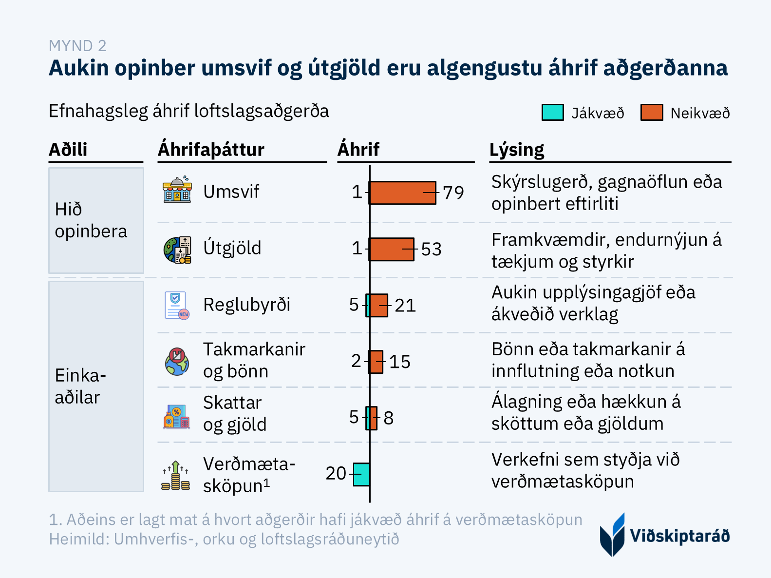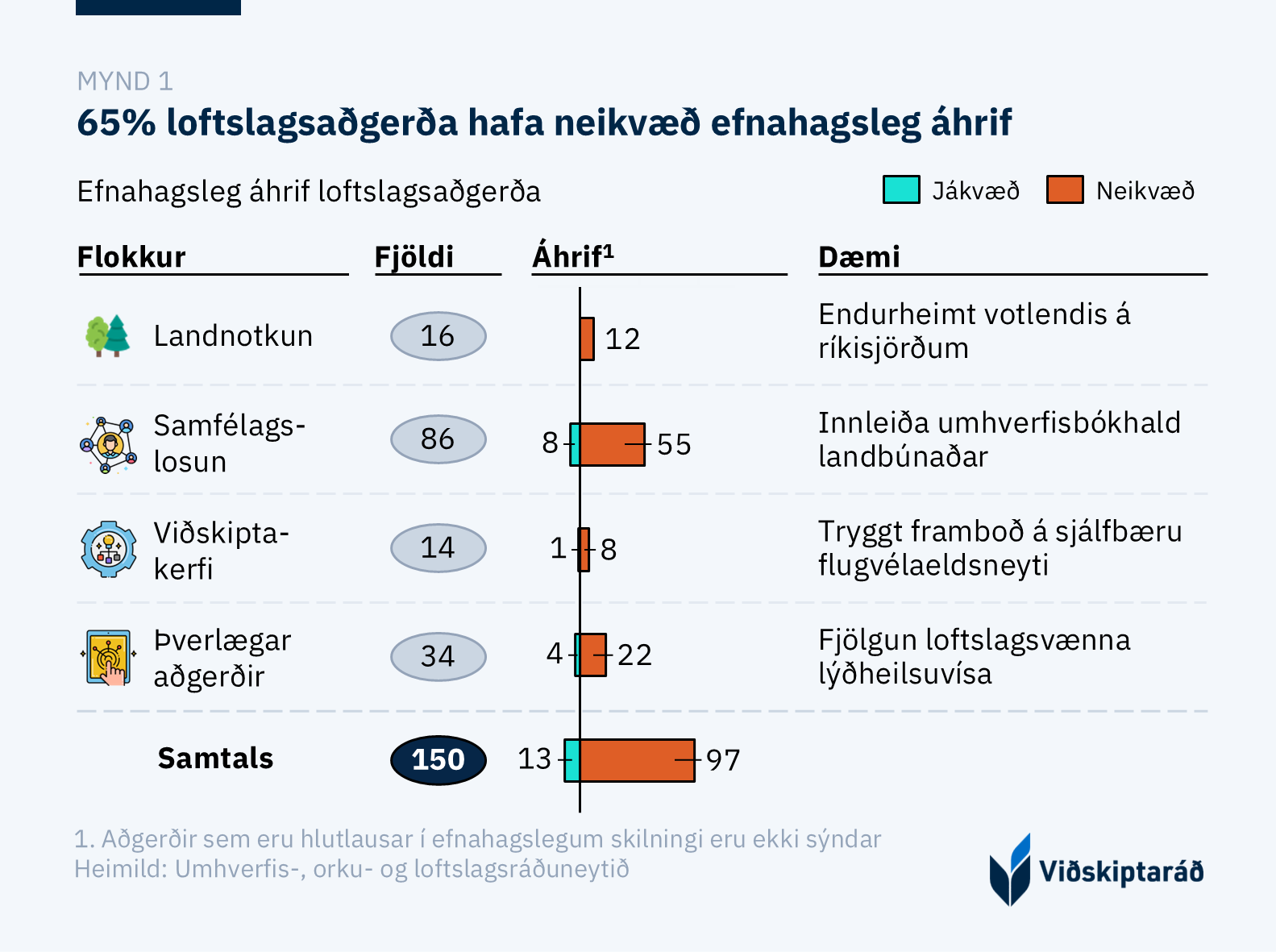 Viðskiptaráð hefur metið efnahagsleg áhrif 150 loftslagsaðgerða stjórnvalda. Úttektin leiðir í ljós að tvær af hverjum þremur aðgerðum hafa neikvæð efnahagsleg áhrif. Ráðið hvetur stjórnvöld til að endurskoða núverandi nálgun og meta kostnað loftslagsaðgerða áður en lengra er haldið.
