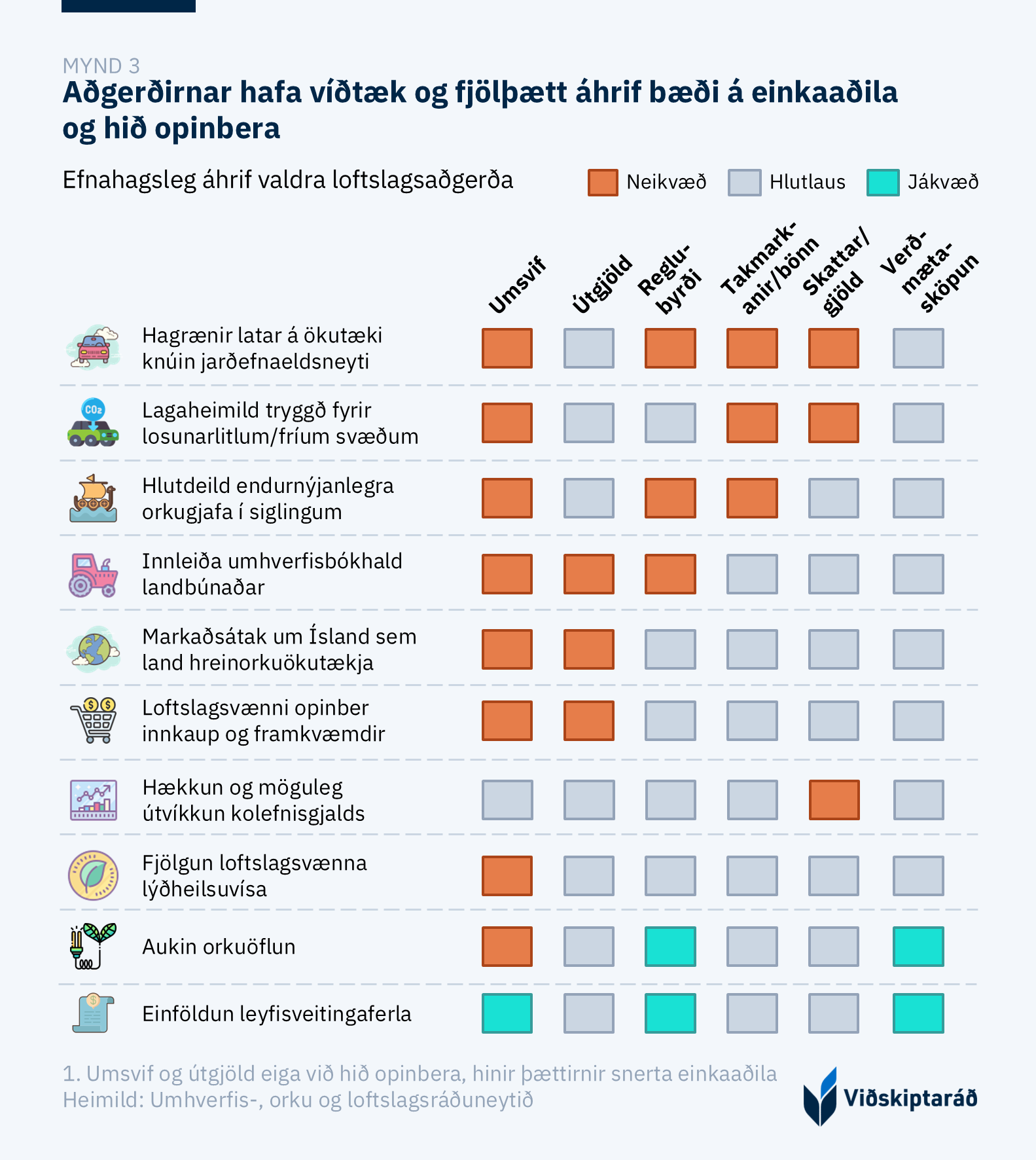 Loftslagsaðgerðir stjórnvalda ættu að innihalda mat á efnahagslegum áhrifum svo hægt sé að bera saman kostnað og ávinning hverrar aðgerðar. Ráðið hvetur ráðuneytið til að bæta slíku mati við allar aðgerðir áður en lengra er haldið.