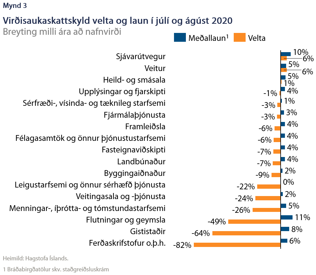 Viðskiptaráð hefur nýlega fjallað um að kreppan og veglegir kjarasamningar leiði til þess að launakostnaður vaxi langt umfram verðmætasköpun. Þetta virðist ekki einungis eiga við ferðaþjónustu, þótt áhrifin séu mest áberandi þar, heldur þvert á atvinnugreinar (mynd 3). Í nær öllum tilfellum hafa laun vaxið meira en tekjur og í flestum tilfellum er munurinn meiri en 10%. Eina undantekningin er veitustarfsemi sem var eina atvinnugreinin sem hafði fjölgað starfsfólki í september sl. Tölurnar sem liggja til grundvallar eru fyrir júlí og ágúst þegar veiran var mun minna útbreidd og sóttvarnaaðgerðir voru mun vægari. Síðan þá hefur staðan þróast til hins verra og laun hækkað m.v. launavísitölu. Því vanmeta gögnin muninn milli launa og veltu í dag.