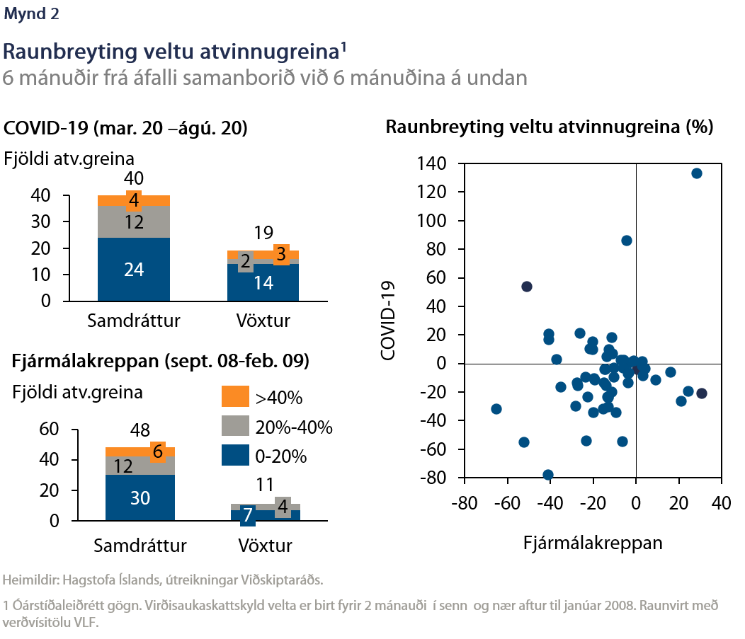 Þrátt fyrir gjörólíkar orsakir og birtingarmyndir voru áhrif fjármálakreppunnar og kórónuveirukreppunnar á hagkerfið fyrst um sinn líkari en ef til vill virðist. Í fyrsta lagi var fjöldi atvinnugreina sem upplifa samdrátt ekki svo frábrugðinn – 40 nú en 48 þá (mynd 2). Í öðru lagi var samdráttur atvinnugreina í báðum kreppum oft meiri en 20%. Engu að síður upplifa að einhverju leyti ólíkar atvinnugreinar nú samdrátt, en bæði þá og nú bitnar kreppan illa á meirihluta atvinnugreina.