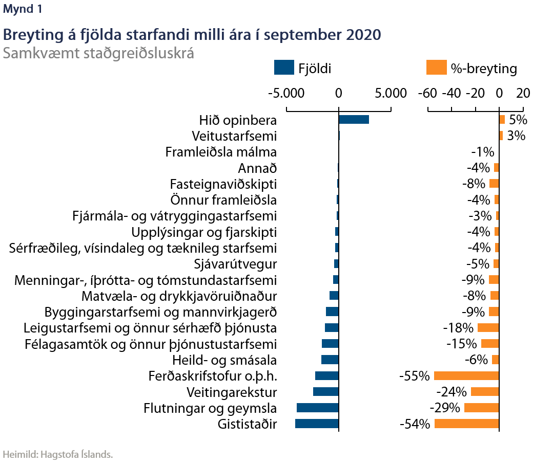 Augljósasta dæmið um hve víðtæk kreppan er sést í tölum um fjölda starfandi (mynd 1). Fyrir utan hið opinbera (stjórnsýslu, heilbrigðisþjónustu og fræðslustarfsemi) hefur aðeins orðið fjölgun starfa í einni atvinnugrein á meðan starfsfólki hefur fækkað í átján greinum. Aðeins hefur orðið fjölgun í veitustarfsemi sem gæti flokkast með hinu opinbera þar sem reksturinn er nær alfarið á höndum ríkis og sveitarfélaga. Eins og búast má við var samdrátturinn mestur í ferðaþjónustugreinum (12.440 störf) en á hinn bóginn hafa 9.457 störf glatast í öðrum greinum, að hinu opinbera undanskildu.