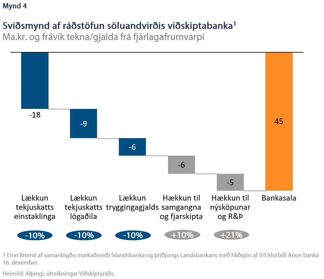 Hins vegar má líka spyrja: Hvað væri hægt að gera fyrir söluandvirði bankanna án þess að breyta afkomu ríkissjóðs? Hægt væri að auka útgjöld og/eða lækka skatta með óendanlega mörgum útfærslum og eina þeirra má sjá í þessari sviðsmynd. Hér er ennþá gert ráð fyrir sama söluverðmæti og að það dreifist jafnt á fimm ár. Líkanið reiknar einungis frávik í tekjum og gjöldum frá frumvarpinu eins og það liggur fyrir núna, að viðbættum breytingatillögum. Þannig má líta á frávikin sem breytingar á heildarskattbyrði. Í sviðsmyndinni lækkar skattbyrði einstaklinga og fyrirtækja um 10% í fimm ár og tryggingagjald lækkar um sem nemur 0,64 prósentustigum. Á hinn bóginn aukast framlög í þá málaflokka þar sem fjárfesting er mest – samgöngu- og fjarskiptamál auk nýsköpunar og R&Þ (mynd 4). Allt þetta á meðan afkoma ríkissjóðs er óbreytt. Taka skal aftur fram að hér er ekki um tillögu að ræða heldur sýna fórnarkostnað þess að ríkið bindi fé skattgreiðenda í svo miklum mæli í eignarhaldi í bönkum.
