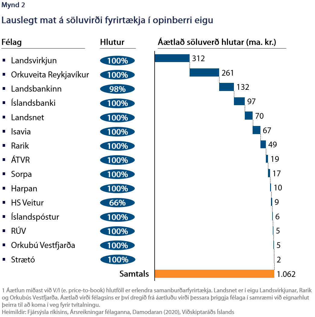 Með þetta í huga hlýtur því að koma til skoðunar að ríki og sveitarfélög losi um eignarhluti í opinberum fyrirtækjum sem falla ekki undir þetta kjarnahlutverk hins opinbera. Ekki eingöngu vegna stöðu efnahagsmála heldur vegna þess að stefnan er skynsamleg. Um gríðarlega fjármuni er að ræða og því ljóst að fremur litlir eignahlutir geta skipt sköpum fyrir ríki og sveitarfélög. Augljóst dæmi, sem Viðskiptaráð hefur áður bent á, eru tveir af þremur stóru viðskiptabönkunum sem eru að nánast öllu leyti í eigu ríkisins. Ef notað er hið varfærna og eldra mat hér að ofan gæti sala á þriðjungi í Landsbankanum og öllum Íslandsbanka skilað 141 milljarði króna í kassann. Ef miðað er við bókfært og markaðsvirði Arion banka (price-to-book eða V/I-hlutfall) í dag gæti virðið verið um 223 milljarðar króna. Víða um heim er hlutabréfaverð sögulega hátt þessa dagana og því er tímasetningin til að undirbúa og hefja söluferli góð.