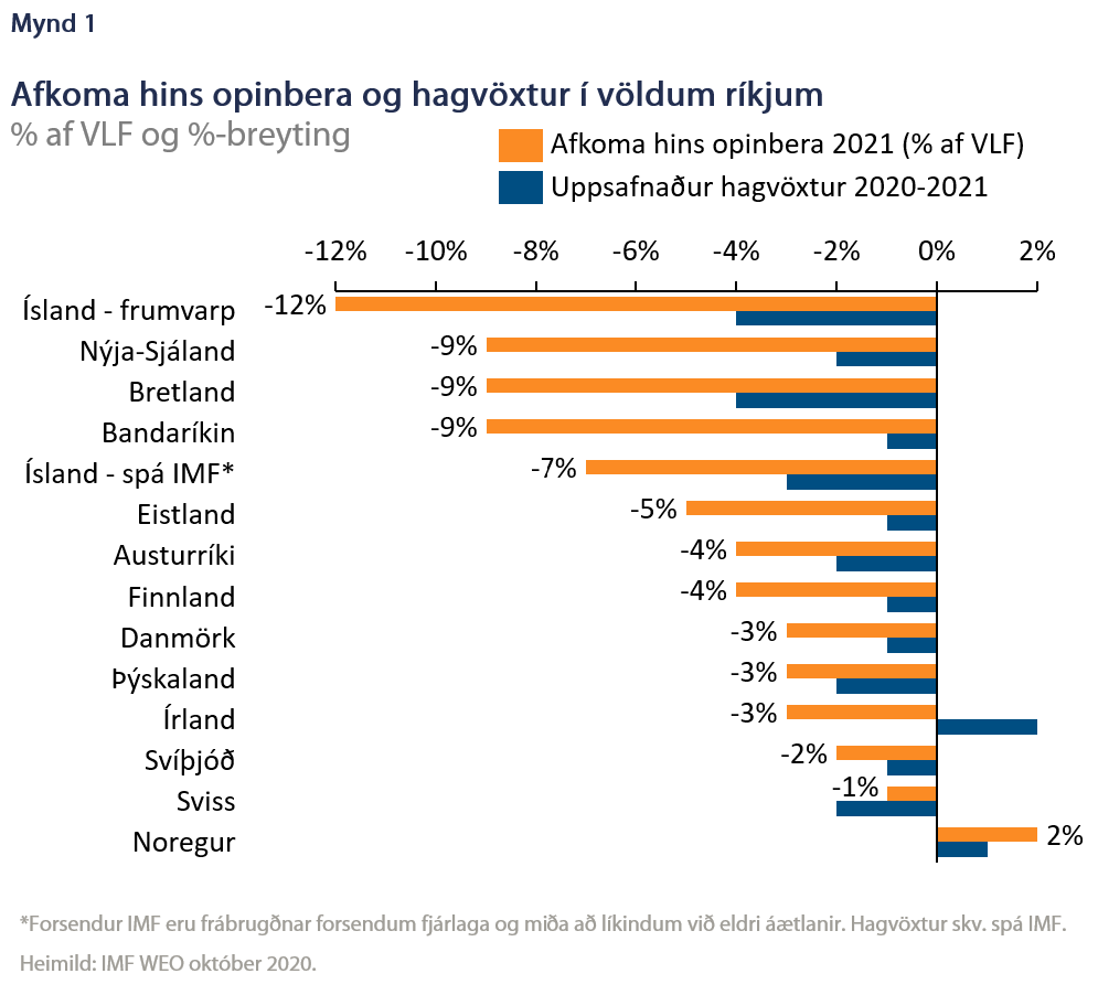 Ef ríkisfjármálin voru á ystu nöf við fjárlagafrumvarpið má velta því upp hvort þau séu að missa jafnvægið og við það að detta fram af bjargbrúninni. Vísbendingu um það má finna í alþjóðlegum samanburði. Miðað við spá Alþjóðagjaldeyrissjóðsins lítur út fyrir að Ísland verði nokkuð sér á báti þegar kemur að halla af opinberum fjármálum á næsta ári (mynd 1) og skv. nýjustu spá OECD verður ekkert OECD ríki með meiri halla en Ísland árið 2022.