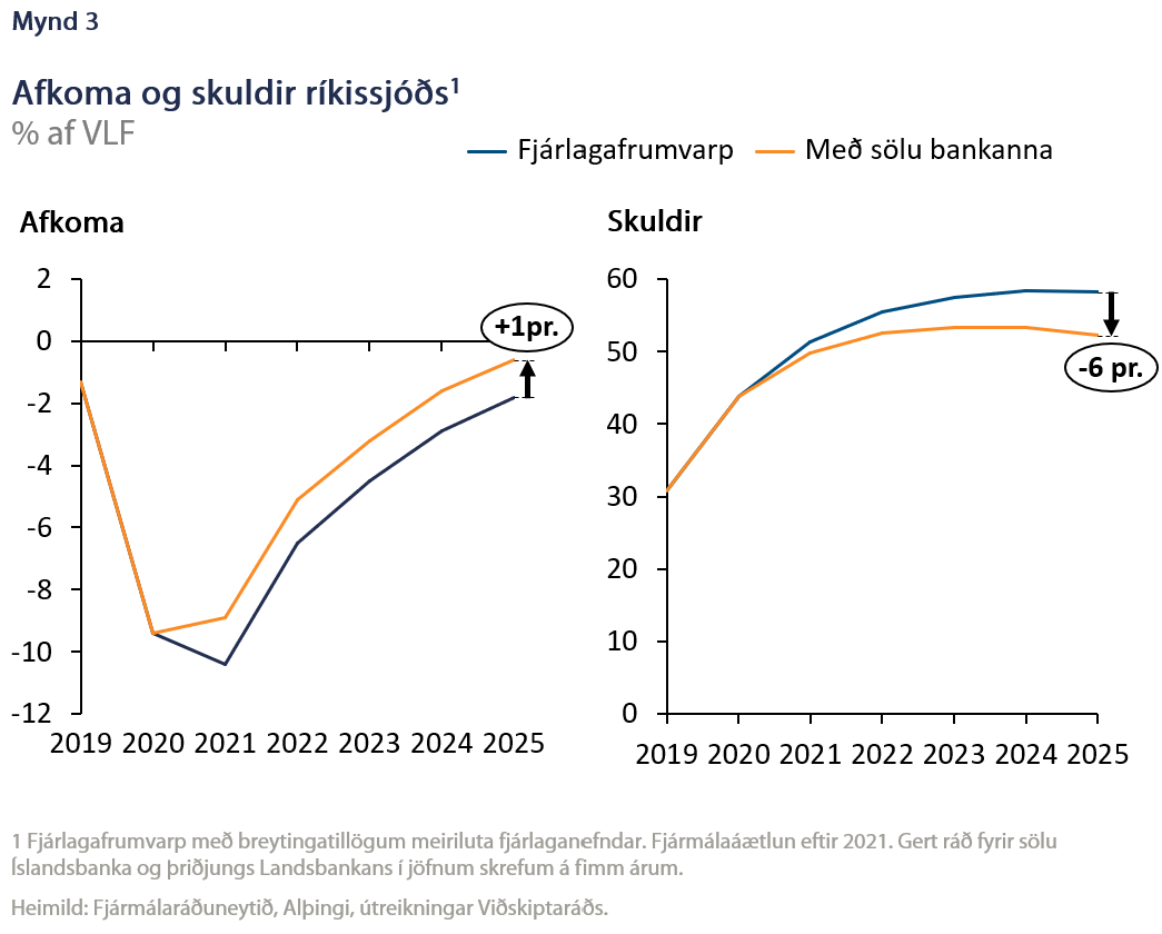 Þýðingu bankasölu fyrir ríkissjóð má nálgast með allavega tvennskonar hætti. Annars vegar með því að spyrja: Hvað þýðir salan fyrir afkomu og skuldir ríkissjóðs? Sviðsmynd af því má nálgast hér og sjá á mynd 3. Gert er ráð fyrir að ríkið selji Íslandsbanka og 1/3 í Landsbankanum í jöfnum skrefum á 5 árum og að söluandvirðið sé miðað við áðurnefnt V/I hlutfall Arion banka. Þannig batnar afkoma ríkissjóðs um rúmlega 45 milljarða króna á ári vegna sölunnar en einnig um tæpa 2 milljarða árlega vegna lækkunar vaxtakostnaðar. Þegar upp er staðið verður afkoman því betri en áður en faraldurinn skall á, ólíkt því sem kveðið er á um í fjármálaáætlun. Ennfremur verða skuldir sem hlutfall af landsframleiðslu teknar að lækka árið 2024 og verða almennt lægri sem söluandvirði og lægri vaxtakostnaði nemur.