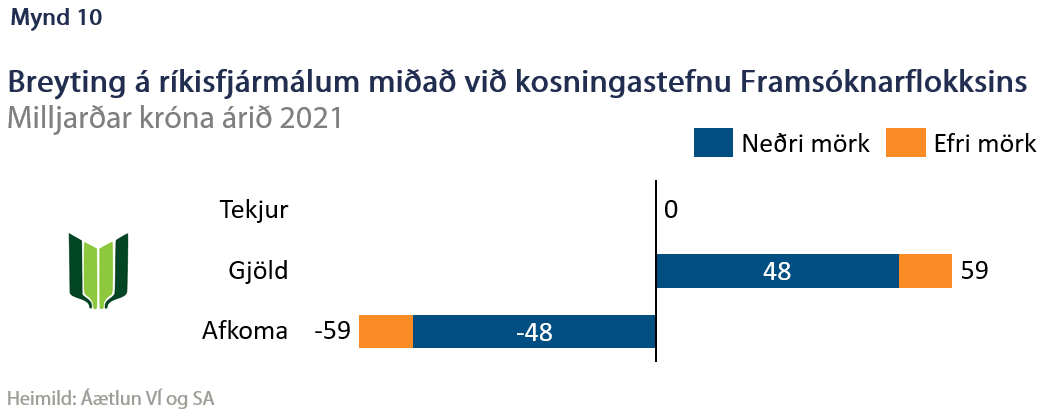 Framsóknarflokkurinn hefur sett stefnu um fjölda mála fyrir komandi kosningar. Flestar þeirra eru útgjaldaaukandi og einkum á sviðum heilbrigðismála og aldraðra og öryrkja. Tillögurnar eru fjölbreyttar á þessum sviðum en í sumum tilfellum er notast er við hugtök eins og „þjóðarátak“ sem ætla má að feli í sér talsverð útgjöld. Einnig vega til dæmis aukin útgjöld til samgangna og stuðningur við frístund barna þungt. Á tekjuhlið er lítið um tillögur en þar ber hæst að færa skattbyrði frá litlum fyrirtækjum til þeirra stærri og að tekið verði upp þrepaskipt tryggingagjald en gert er ráð fyrir að sú aðgerð sé tekjuhlutlaus. Heildaráhrif af þeim tillögum eru háð mikilli óvissu en gætu dregið úr tekjum ríkisins um nokkra milljarða króna. Samanlagt er áætlað að afkoma ríkissjóðs rýrni um 53 til 64 ma.kr. (mynd 10).