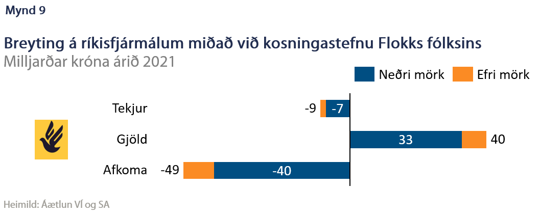 Flokkur fólksins er heilt yfir með fá en umfangsmikil stefnumál. Stefnt er að hækkun skattleysismarka upp í 350.000 krónur á mánuði en á móti kemur að þau gera einnig ráð fyrir að persónuafslátturinn fjari út eftir sveigðum ferli. Þannig yrði skattbyrðin færð af þeim tekjulægri og yfir á þá tekjuhærri. Ætla má að þetta lækki tekjuskatt um rúmlega 40 ma.kr. Flokkurinn stefnir einnig að því að skattleggja iðgjöld lífeyrissjóða en ekki útgreiðslur líkt og í dag, sem færir tekjur um tugi milljarða króna fram í tíma og á milli kynslóða. Þá virðist verulega eiga að gefa í í málefnum aldraðra og öryrkja og að einhverju leyti í heilbrigðismálum. Útgjöld í heild hækka þó minna en mætti ætla vegna þess að flokkurinn hyggst draga úr „hvers konar óþarfa útgjöldum ríkissjóðs“. Niðurstaðan er eigi að síður sú að afkoman verður 40 til 49 milljörðum króna rýrari (mynd 9).