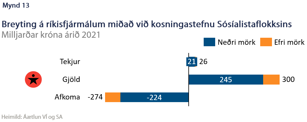 Sósíalistaflokkurinn hefur lagt fram fjölbreyttar tillögur. Á útgjaldahlið má merkja fyrirætlanir um hækkun útgjalda í mörgum málaflokkum. Tillögur í heilbrigðisþjónustu miða einkum að gjaldfrelsi og gætu hlaupið á tugum milljarða króna. Það sem hins vegar vegur langþyngst eru húsnæðismál. Í fyrsta lagi eru áætlanir um að byggja upp 3.000 íbúðir á ári. Gefið hefur verið upp að horft sé til meðalstærðarinnar 70 fermetra. Sé miðað við Reiknilíkan Hannarr, sem tekur tillit til ýmis kostnaðar sem ekki er tekið tillit í byggingarvísitölu Hagstofunnar, er um að ræða 85 ma.kr. á ári. Í öðru lagi er lagt til að húsnæðiskostnaður sé í engum tilfellum yfir 25% af útgjöldum heimila með hjálp bóta. Vægi húsnæðis í neyslu landsmanna er hins vegar að meðaltali hærra, eða 26%, svo kostnaður við slíkt er upp á marga tugi milljarða króna á ári. Á tekjuhlið má finna fjölmargar skattahækkanir sem gætu samtals skilað nokkrum tugum milljarða króna í tekjur. Hins vegar er gert ráð fyrir verulegum skattalækkunum hjá millitekjuhópum og algjöru skattfrelsi við lægstu laun svo niðurstaðan er að tekjur aukast lítið. Samandregið er afkoman 224 til 274 ma.kr. lakari en annars hefði orðið (mynd 13). Lauslega má því áætla að árleg lántökuþörf ríkissjóðs tvöfaldist.