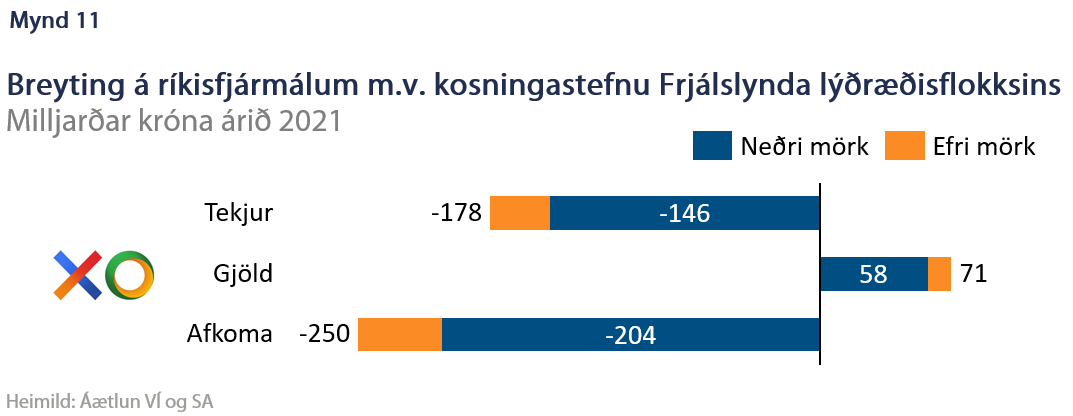 Frjálslyndi lýðræðisflokkurinn setur fram afar fjölbreytt stefnumál fyrir komandi kosningar. Í útgjöldum kennir ýmissa grasa. Þar vega málefni aldraðra og öryrkja þungt, einkum vegna afnáms skerðinga. Þó útgjaldaukning vegi þyngra virðist stefnt á lækkun útgjalda, t.d. í utanríkismálum. Þá er gert ráð fyrir að öll störf ríkisins verði án staðsetningar sem gæti dregið úr kostnaði auk þess sem hagræða á almennt í ríkisrekstrinum. Á tekjuhlið má finna skattalækkanir á t.d. fjármagn og lækkun virðisaukaskatts. Það sem vegur þyngst er hækkun skattleysismarka sem þýðir að tekjuskattur dregst saman um meira en 100 ma.kr. Allt þetta leiðir til þess að afkoman rýrnar um 204 til 250 ma.kr. sem þýðir að halli ríkissjóðs yrði hátt í tvöfalt meiri en reiknað er með í ár (mynd 11).