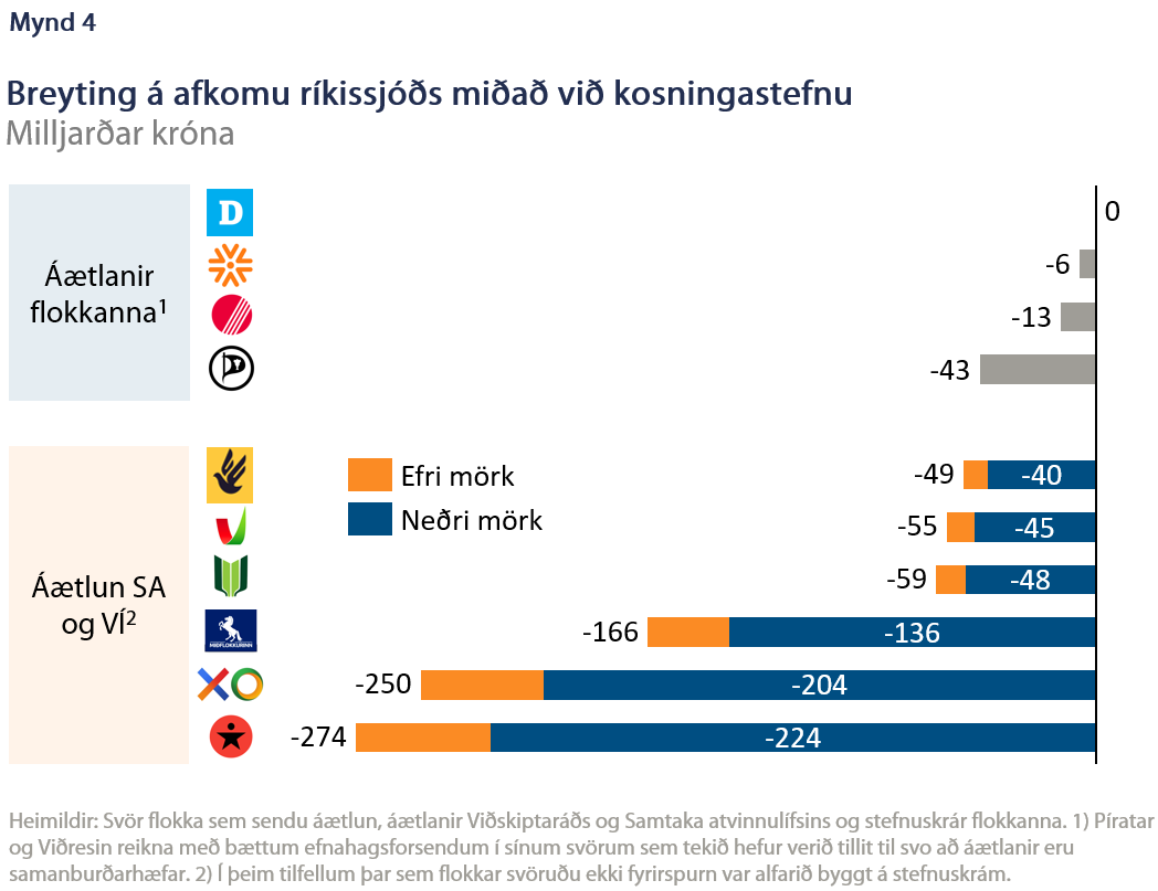 Helstu niðurstöður má sjá á mynd 4. Í þessu samhengi má nefna að fjármálaáætlun gerir ráð fyrir 320 ma.kr. halla af ríkissjóði í ár. Mikilvægt er að hafa í huga að samanburður er takmarkaður nema í þeim tilfellum þar sem ríkisfjármál voru alfarið áætluð af SA og VÍ út frá stefnuskrám. Þeir flokkar sem skiluðu áætlunum eru ekki að fullu samanburðarhæfir af tvennum ástæðum. Í fyrsta lagi því Píratar gera ráð fyrir bættum efnahagsforsendum, eða svo bættum að það sem í fyrstu virðist aukinn halli verður stóraukinn afgangur, annars vegar vegna aukinna skatttekna vegna umsvifa og hins vegar minni útgjalda vegna atvinnuleysis. Einnig gerir Viðreisn ráð fyrir bættum forsendum en þó á umtalsvert minni skala en Píratar en í báðum tilfellum hefur verið horft fram hjá þeim svo að áætlanir séu samanburðarhæfar. Í öðru lagi er ljóst að þeir flokkar sem svöruðu beiðninni hafa fleira á stefnuskránni en það sem kemur fram í svarinu sem flækir samanburð þeirra við þá flokka sem sendu ekki áætlanir.
