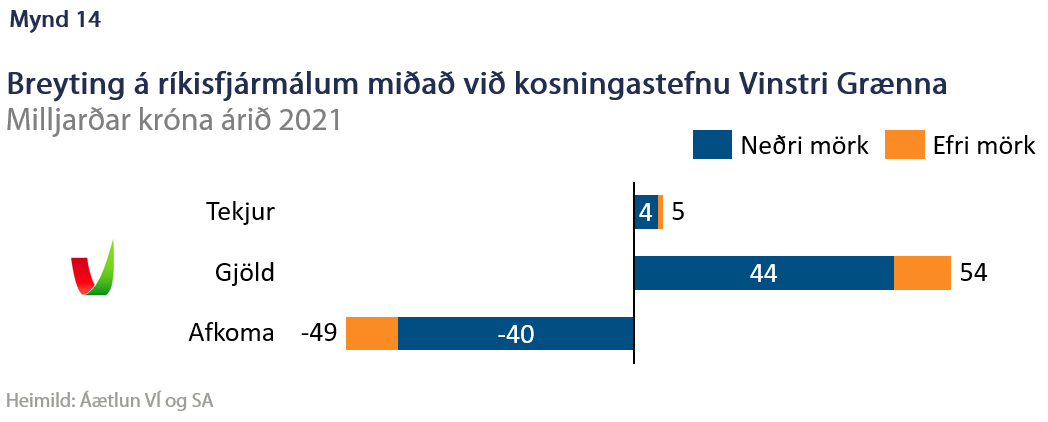 Vinstri græn leggja til margar aðgerðir sem eru til þess fallnar að auka útgjöld en þó virðist sem það sé í fremur litlum skrefum miðað við ýmsa aðra flokka þar sem orðalag er tiltölulega almennt. Stærstu málaflokkar ríkisins vega þungt í tillögunum, eins og menntamál, heilbrigðismál og málefni aldraðra og öryrkja, sem skýrir að mestu talsverða aukningu útgjalda. Einnig er fyrirhugað að bæta í barnabótakerfið. Á tekjuhlið er helst að finna fyrirætlanir um þrepaskiptan fjármagnstekjuskatt og því gert ráð fyrir lítilsháttar tekjuaukningu. Niðurstaðan er því 45 til 55 ma.kr. aukinn halli á ríkissjóði (mynd 14).