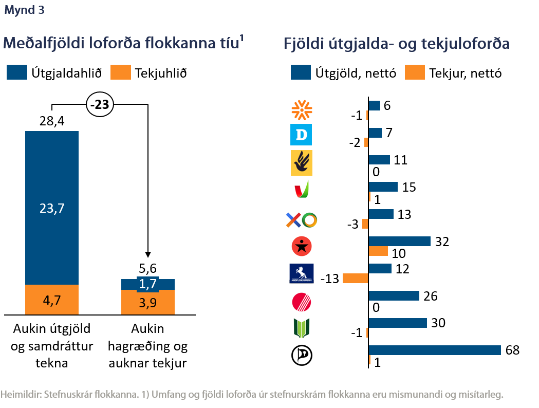 Við tókum saman loforð flokkanna sem fólu í sér annars vegar aukin útgjöld og samdrátt tekna og hins vegar aukna hagræðingu og auknar tekjur. Alls eru þau 340 talsins en mikill meirihluti þeirra er til þess fallinn að auka útgjöld og minnka tekjur. Aðeins 56 þeirra hafa jákvæð áhrif á afkomu, þ.e. draga úr útgjöldum eða auka tekjur. Fjöldi útgjalda- og tekjuloforða er mismunandi eftir flokkum sem gefur einnig vísbendingu um að umfang einstaka loforða sé afar misjafnt (mynd 3).