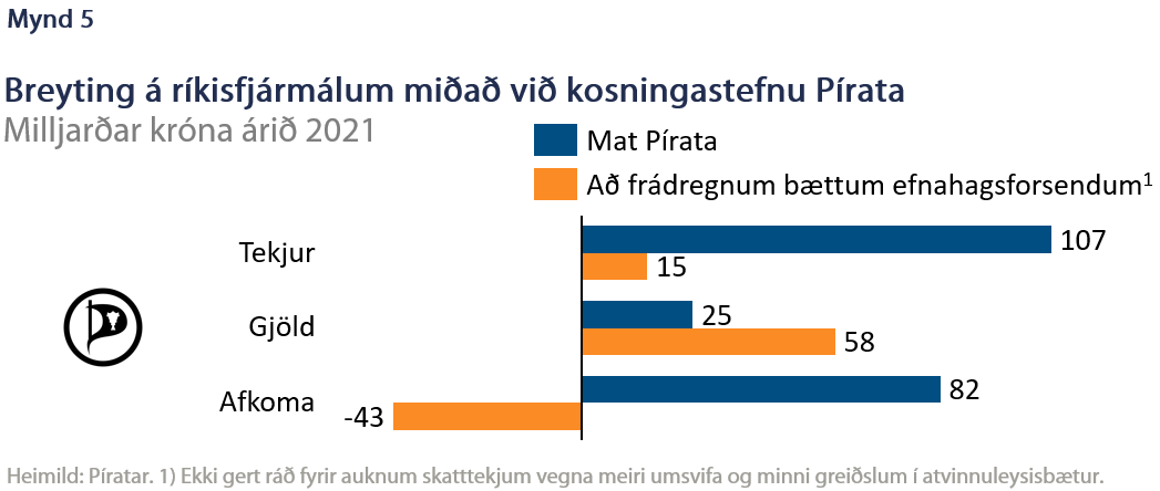 Píratar skiluðu ítarlegum niðurstöðum í Grid-líkani Viðskiptaráðs og voru eini flokkurinn sem gerði það. Heildarniðurstaðan er hér á mynd 5 og sjá má talsverðan bata í ríkisfjármálunum. Hér er samanburðurinn við aðra flokka þó takmarkaður því Píratar gerðu ráð fyrir verulega bættum efnahagsforsendum sem m.a. skilar sér í 28% hækkun tekna af virðisaukaskatti, 9% hækkun tekna af tekjuskatti einstaklinga og 30% samdrætti útgjalda vinnumarkaðsmála vegna minna atvinnuleysis. Til þess að bæta samanburð við aðra má hér líka sjá hvernig fjárlögin myndu breytast ef ekki er gert ráð fyrir þessum bættu efnahagsforsendum. Varast skal þó að túlka þá 43 ma.kr. rýrnun á afkomu sem það felur í sér þar sem ætla má að lakari efnahagsforsendur myndu breyta öllu matinu. Það endurspeglar þó aukna slökun á aðhaldi í ríkisfjármálum, sem getur kynt undir verðbólgu og aukið líkur á vaxtahækkunum Seðlabankans. Enn fremur má benda á að enginn flokkur leggur til fleiri tillögur um útgjaldaaukningu, í hlutfalli við tekjuaukningu, en Píratar.