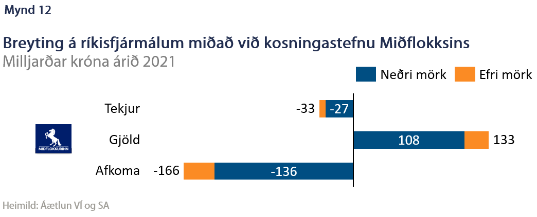 Miðflokkurinn leggur áherslu á ýmis málefni sem almennt auka útgjöld eða draga úr tekjum. Á útgjaldahlið vega tillögur í heilbrigðisþjónustu nokkuð þungt ásamt áætlun um að greiða hverjum fullorðnum Íslendingi 100.000 krónur úr ríkissjóði, sem kostar nærri 29 ma.kr. Fjármagna skal slíkt með arðgreiðslum, losunarheimildum og veiðigjöldum sem ekki fæst séð að muni hækka með sama hætti. Fjölmargar tillögur snúa að málaflokki aldraðra og öryrkja og þó stærðargráðan sé óljós má af stefnuskrá dæma að hún sé efalítið stór. Á tekjuhlið má finna skattalækkanir, einkum sem beinast að þeim byggðum sem mæta hindrunum eða búa við skerta þjónustu. Samanlagt er því um að ræða rýrnum afkomu ríkissjóð sem nemur 136 til 166 milljörðum króna (mynd 12).