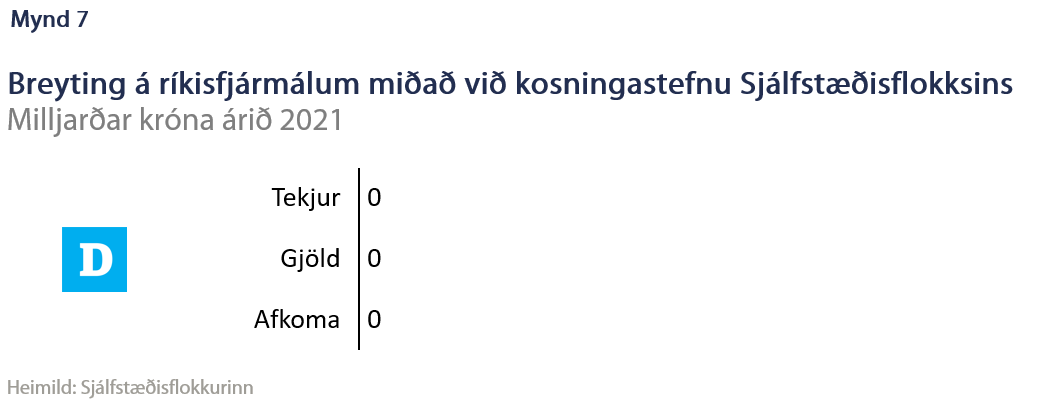 Sjálfstæðisflokkurinn hefur setið í ríkisstjórn frá 2013 og haft fjármálaráðuneytið sl. fjögur ár svo ekki kemur á óvart að í svörum frá flokknum er gert ráð fyrir að fylgja forsendum fjármálaáætlunar. Þannig er ekki gert ráð fyrir breytingum á tekjum eða gjöldum. Líkt og í tilfelli Samfylkingarinnar leggur flokkurinn hins vegar til skattalækkanir og nokkrar aðgerðir sem gætu aukið útgjöld sem gera verður ráð fyrir að muni rúmast innan þess ramma, ráðist af efnahagsforendum eða komi til framkvæmdar með tíð og tíma.