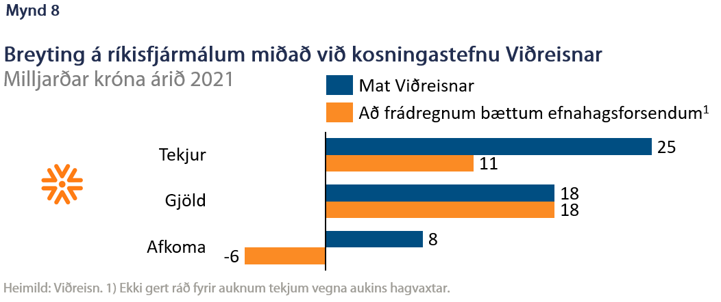 Viðreisn svaraði erindinu fyrst til bráðabirgða þar sem fram kom að ekki yrði ráðist í skattahækkanir eða skuldaaukningu. Á sunnudag kynnti flokkurinn svo nánari tillögur opinberlega þar sem niðurstaðan er sú að afkoma batnar um 8 ma.kr. á ári á meðan tekjur og gjöld aukast nokkuð (mynd 8). Auknar tekjur má rekja til kolefnisgjalda, sölu aflaheimilda og hagvaxtar á meðan útgjöld aukast einkum til heilbrigðis-, velferðar- og umhverfismála. Einnig er gert ráð fyrir verulegum vaxtalækkunum á skuldum ríkissjóðs, eða tæplega 9 ma.kr. á ári. Líkt og í tilfelli Pírata er matið birt án áhrifa hagvaxtar á tekjur en þá rýrnar afkoman um 6 ma.kr. Viðreisn birti áætlanir sínar fyrir kjörtímabilið í heild sem er enn fremur frábrugðið öðrum flokkum og gerir samanburð erfiðari.