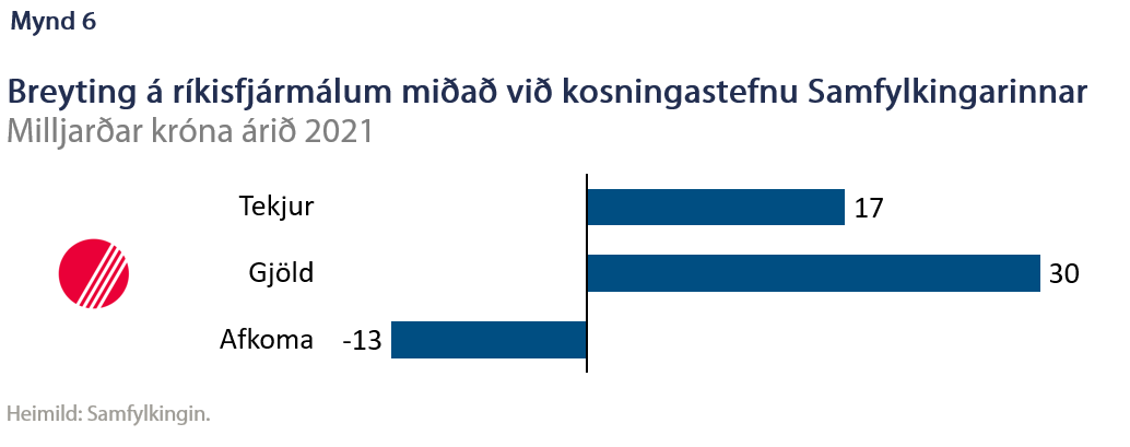 Samfylkingin skilaði skriflegu svari um ríkisfjármálin. Þar er t.d. gert ráð fyrir eignaskatti og hækkun veiðigjalda á tekjuhlið en auknum stofnframlögum almennra íbúða, hækkun barnabóta og hækkun lífeyris á útgjaldahlið. Niðurstaðan sést hér fyrir neðan (mynd 6) en útgjöld aukast meira en tekjur svo niðurstaðan er 13 ma.kr. meiri halli. Taka skal fram að í stefnu flokksins eru margar aðrar tillögur sem eru yfirleitt til þess fallnar að auka útgjöld eða draga úr tekjum, eins og að létta álögur á lítil fyrirtæki, þjóðarátak í geðheilbrigðisþjónustu, hækkun grunnframfærslu námsmanna og aukin framlög til rannsóknar- og vísindasjóða. Í svarinu var ekki gert ráð fyrir útgjöldum og öðrum breytingum vegna þessara málaflokka, í það minnsta í bráð.