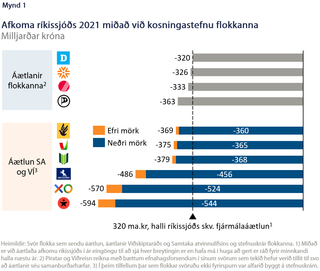 Samantekt: Samtök atvinnulífsins (SA) og Viðskiptaráð Íslands (VÍ) hafa tekið saman helstu breytingar á ríkisfjármálum sem stefnur stjórnmálaflokkanna fela í sér. Útgjaldaaukandi loforð eru margfalt fleiri en tekjuaukandi svo óskað var eftir upplýsingum frá flokkunum sjálfum um hvernig tekjur, gjöld og afkoma væru ef tiltekinn flokkur væri við völd. Þeir fjórir flokkar sem svöruðu erindinu, Píratar, Samfylking, Sjálfstæðisflokkur og Viðreisn, gera ráð fyrir allt frá lítillega auknum halla eða verulega bættri afkomu. Ef horft er fram hjá bættum efnahagsforsendum hjá Viðreisn og Pírötum gera allir flokkar nema Sjálfstæðisflokkur ráð fyrir auknum halla. SA og VÍ mátu stefnuskrár hinna flokkanna, eftir því sem hægt var að meta forsendur, sem felur í sér allt frá 45 til 55 ma.kr. aukningu í halla hjá Vinstri grænum yfir í 224 til 274 ma.kr. aukinn halla hjá Sósíalistaflokknum. Til samanburðar gerir fjármálaáætlun ráð fyrir að afkoma ríkissjóðs verði neikvæð um 320 ma.kr. í ár, eða 10,2% af landsframleiðslu og væri því um halla af stærðargráðunni 365 til 594 ma.kr. að ræða.